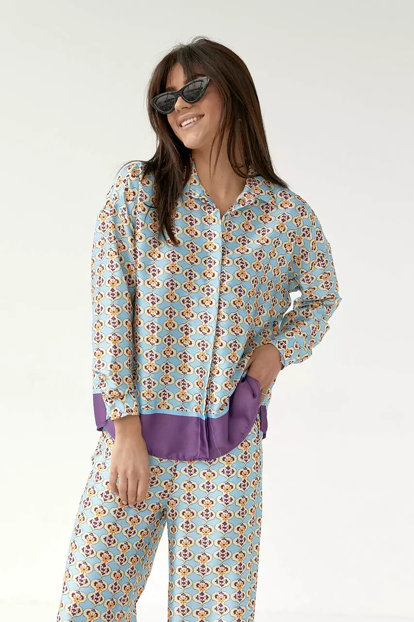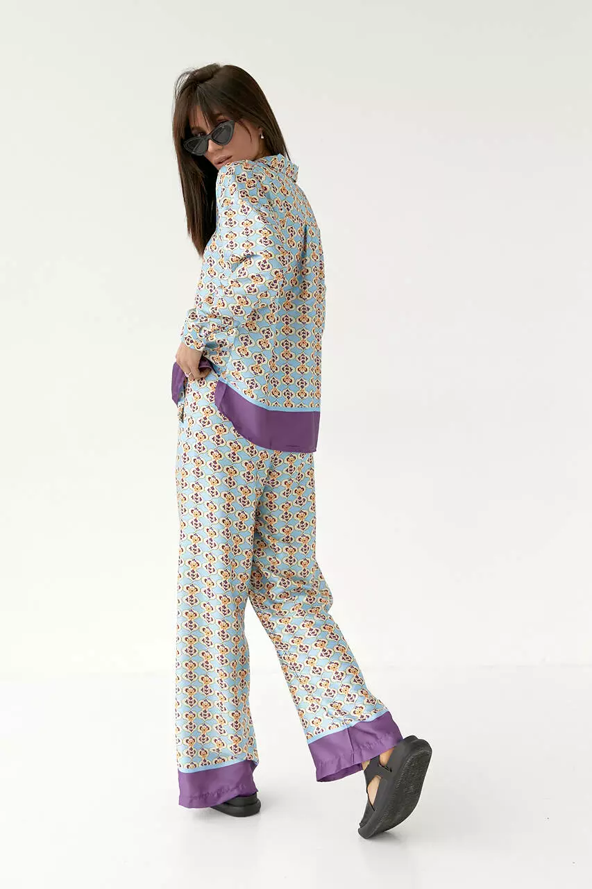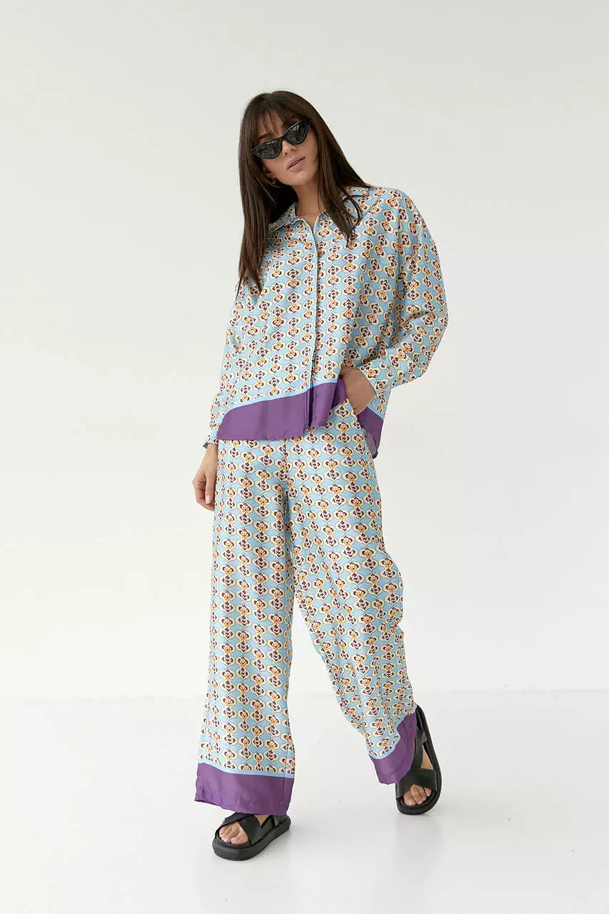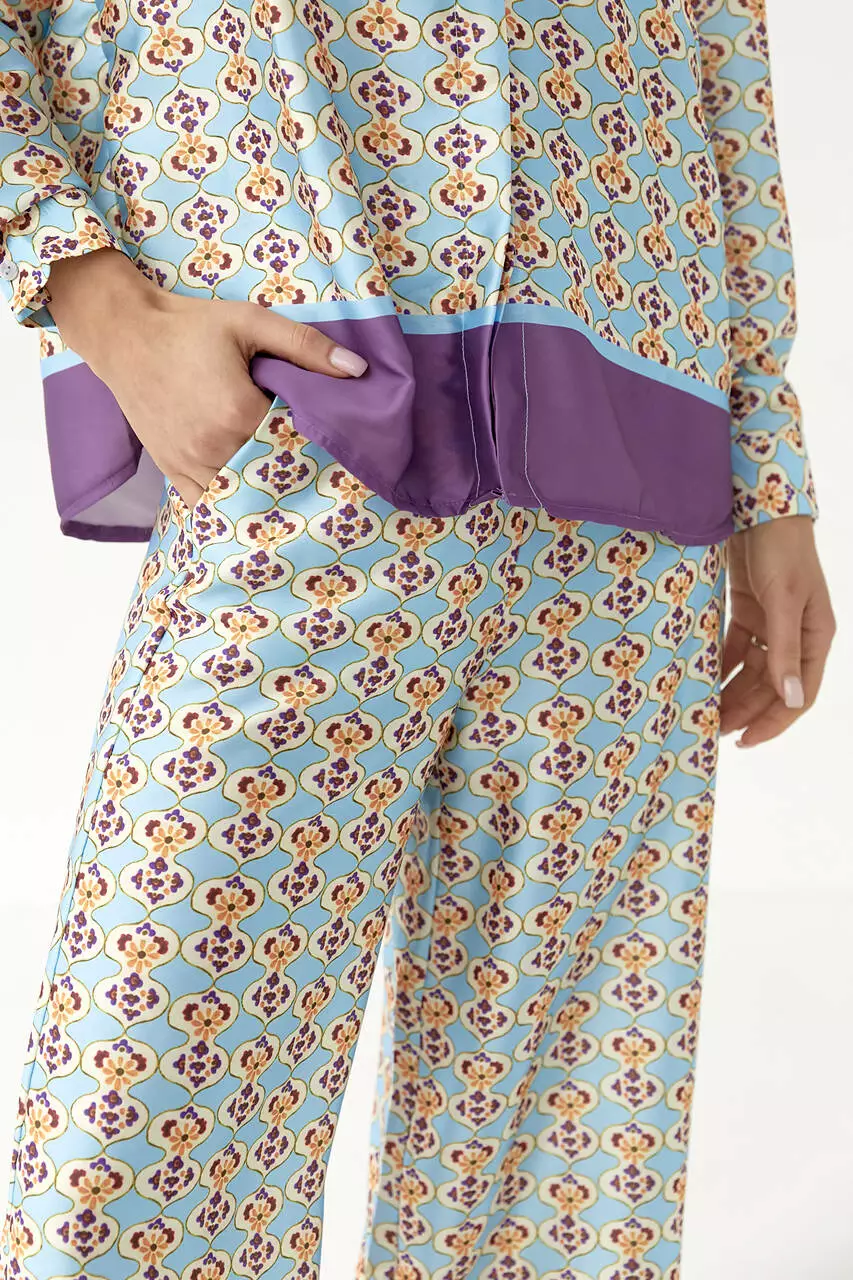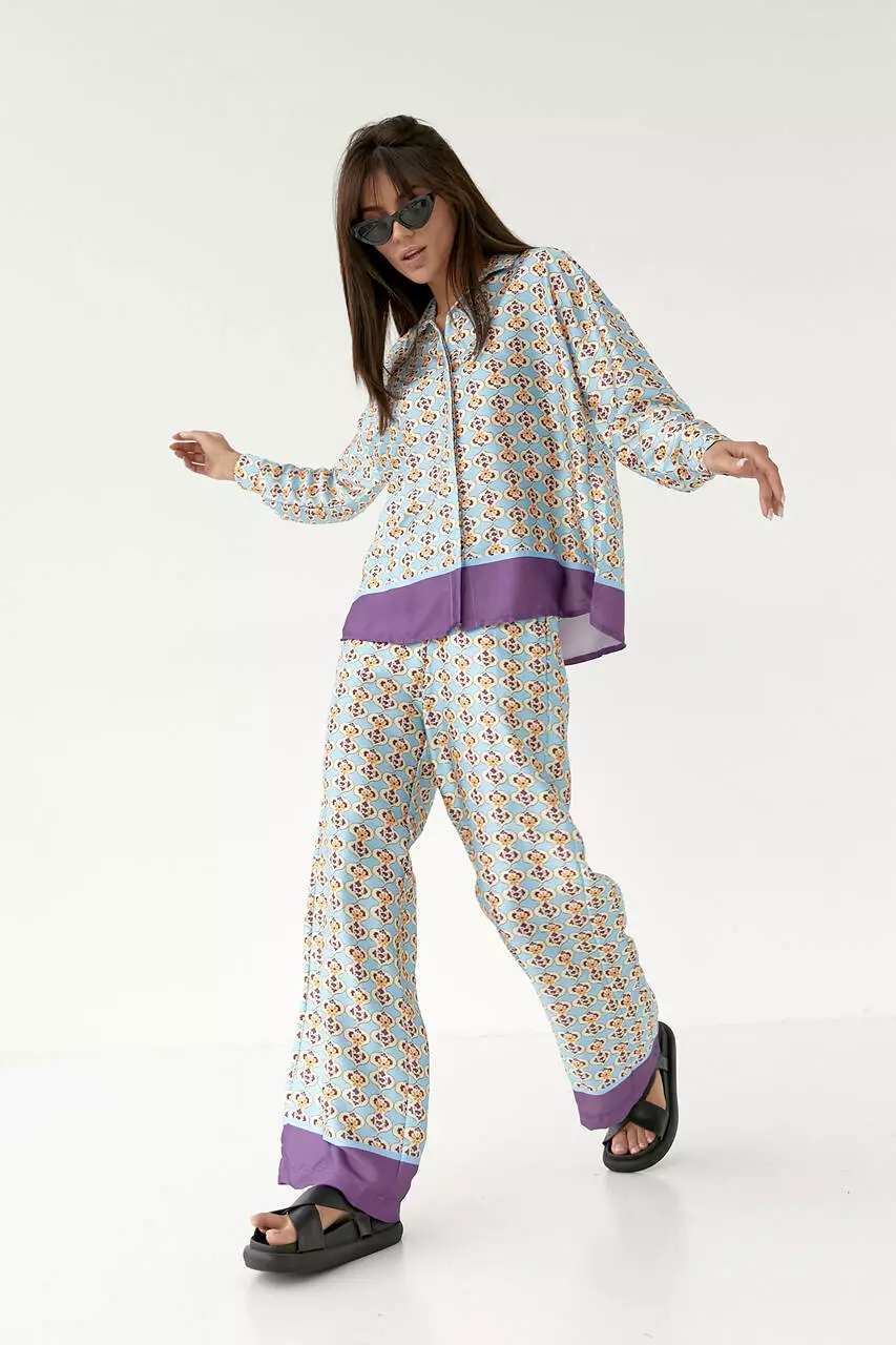 легкой, но плотной атласной ткани с ярким узором. Штаны идут с