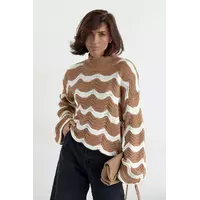 В модели прямой низ и манжеты длинных рукавов с волнистыми краями. Само изделие выполнено из ажурной вязки с волнистым узором двух цветов.