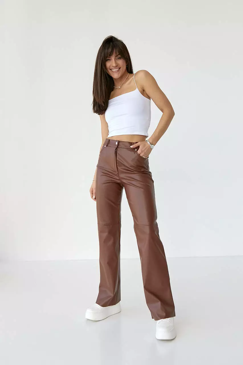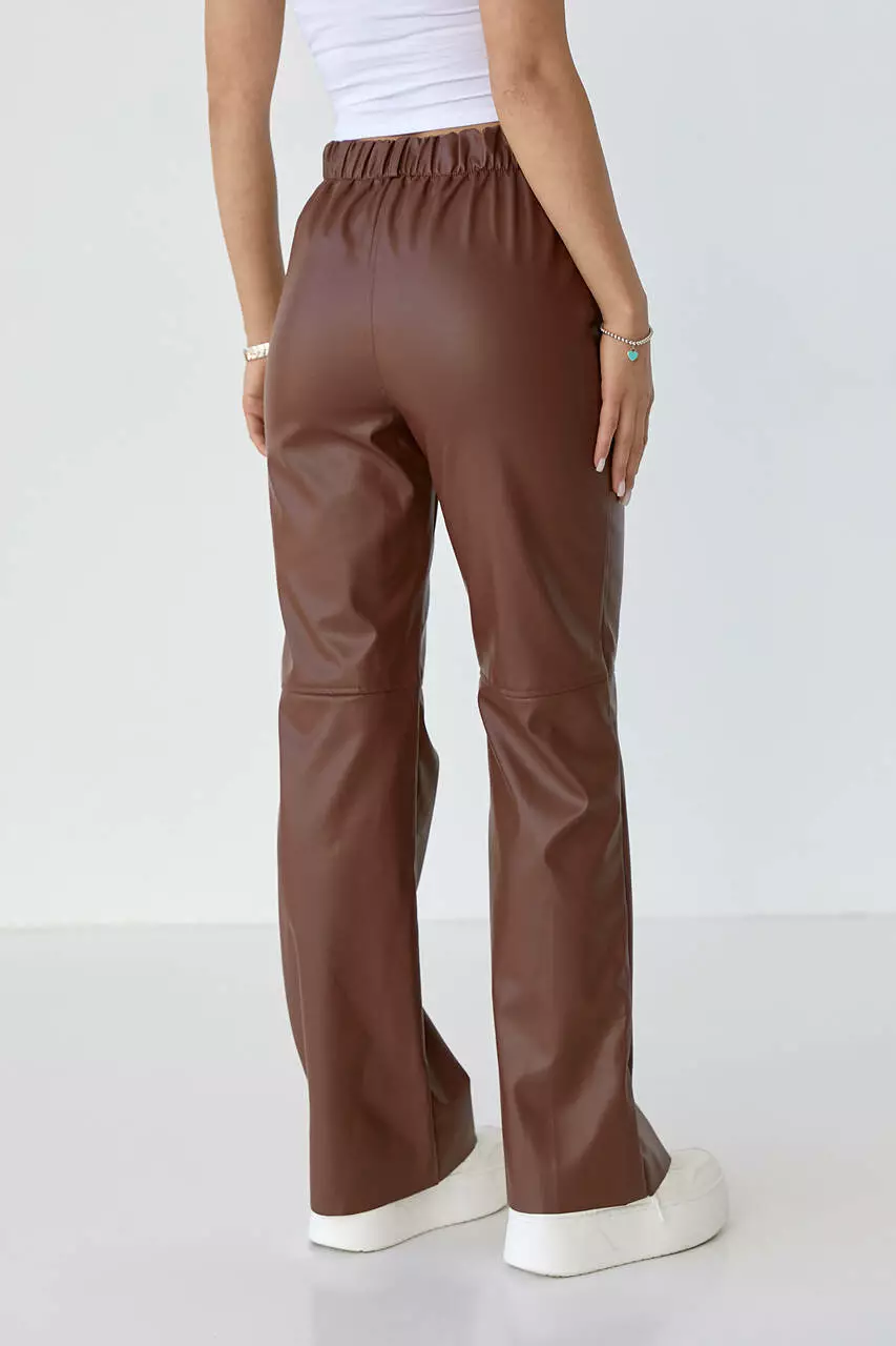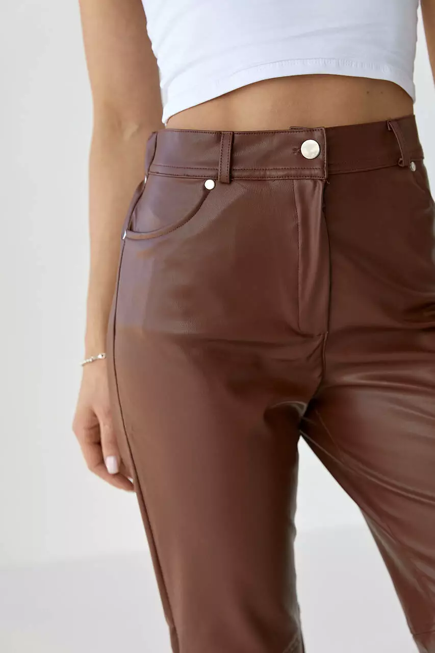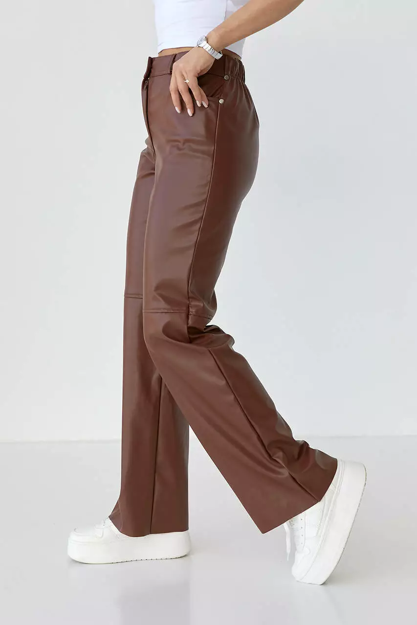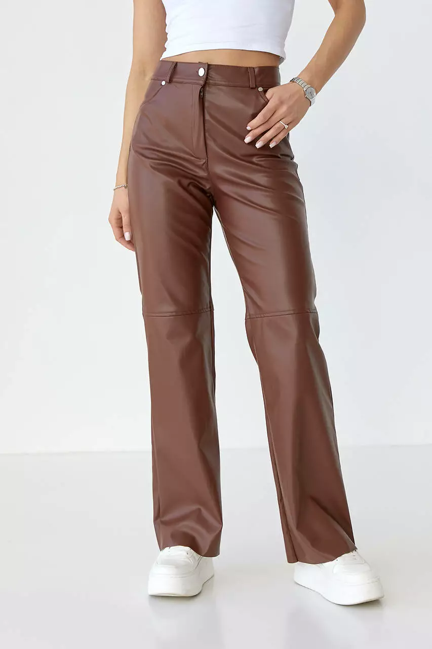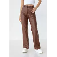 Брюки женские из кожзама с высокой посадкой - коричневый цвет, S (есть размеры)