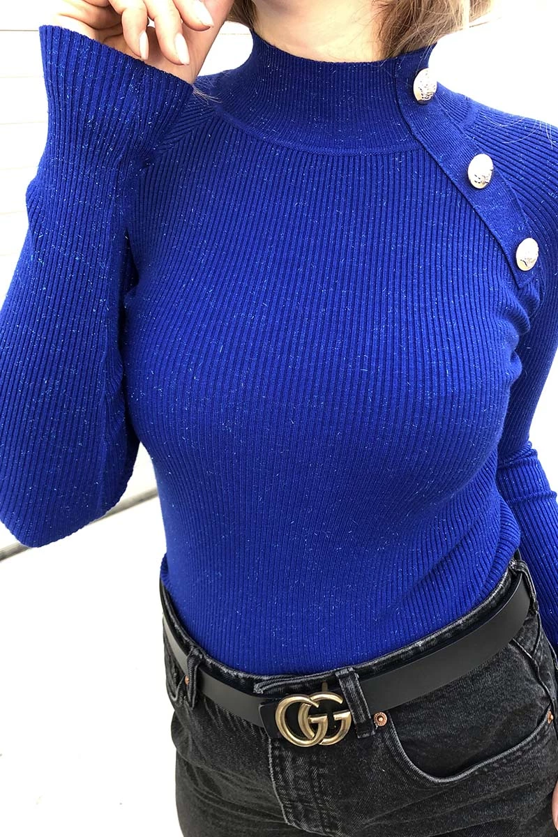 Модная водолазка украшена тремя большими золотистыми брендовыми