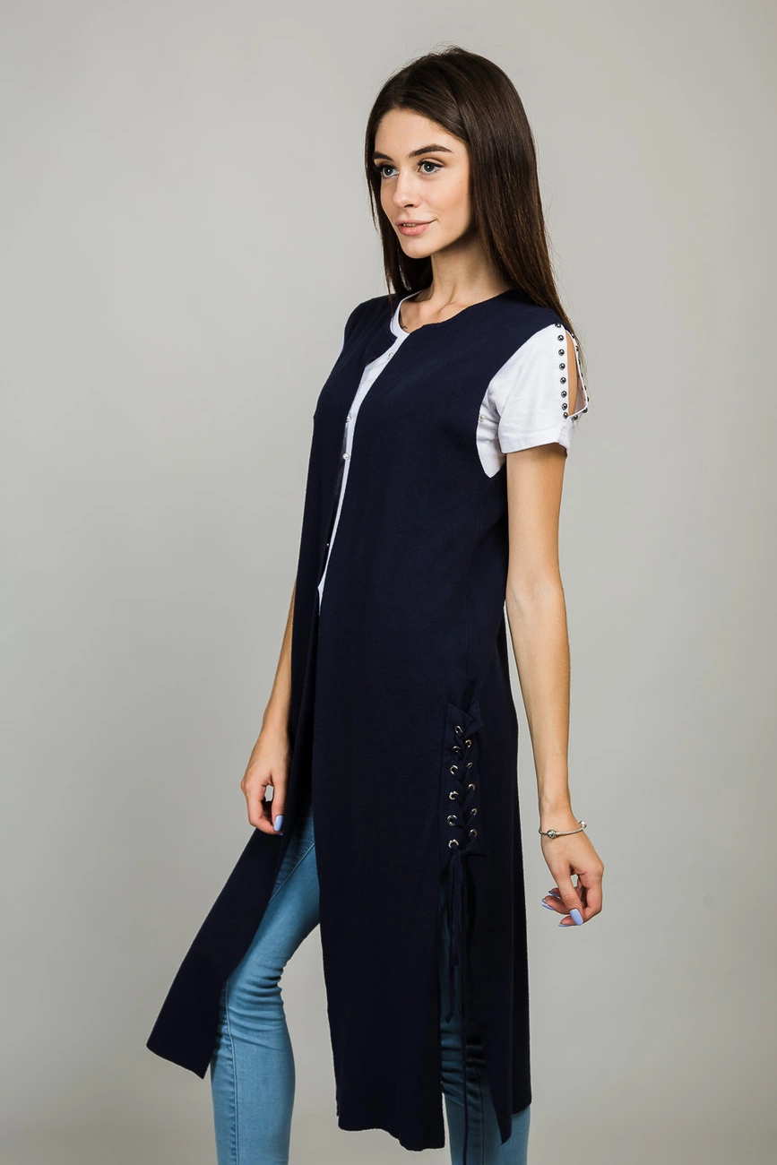 Эта удлиненная женская жилетка, в составе которой соединились