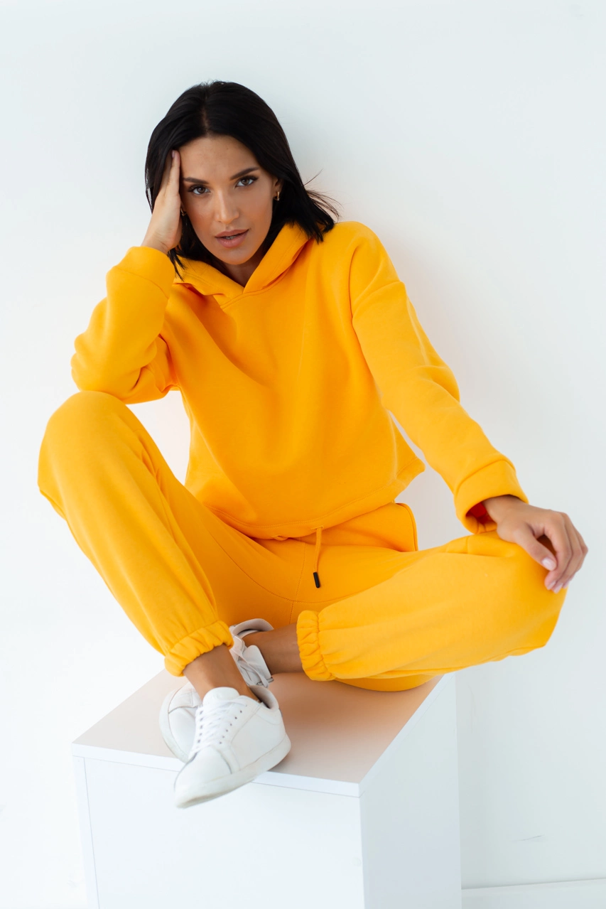Женский спортивный костюм с капюшоном изготовлен из теплого футера с начесом. Комплект состоит из худи и джоггеров с боковыми карманами.