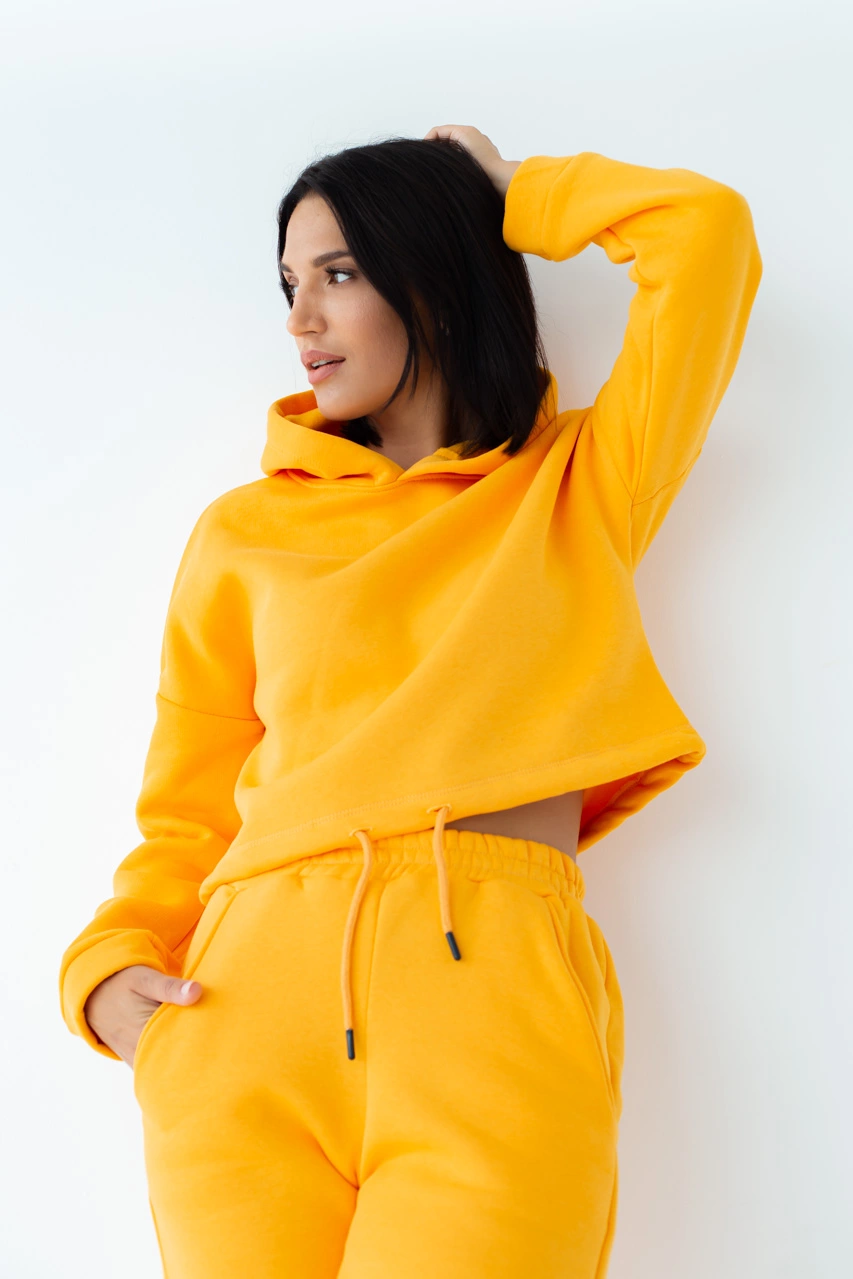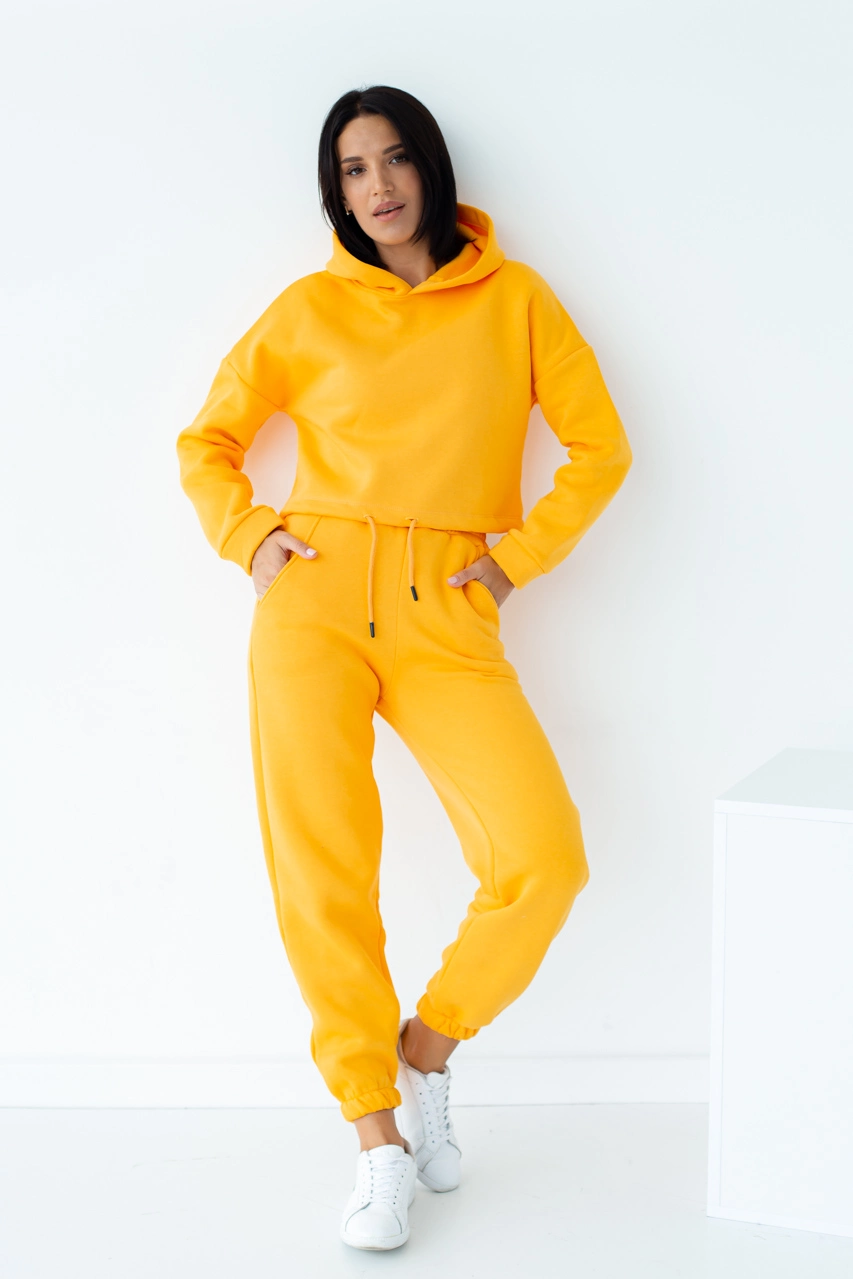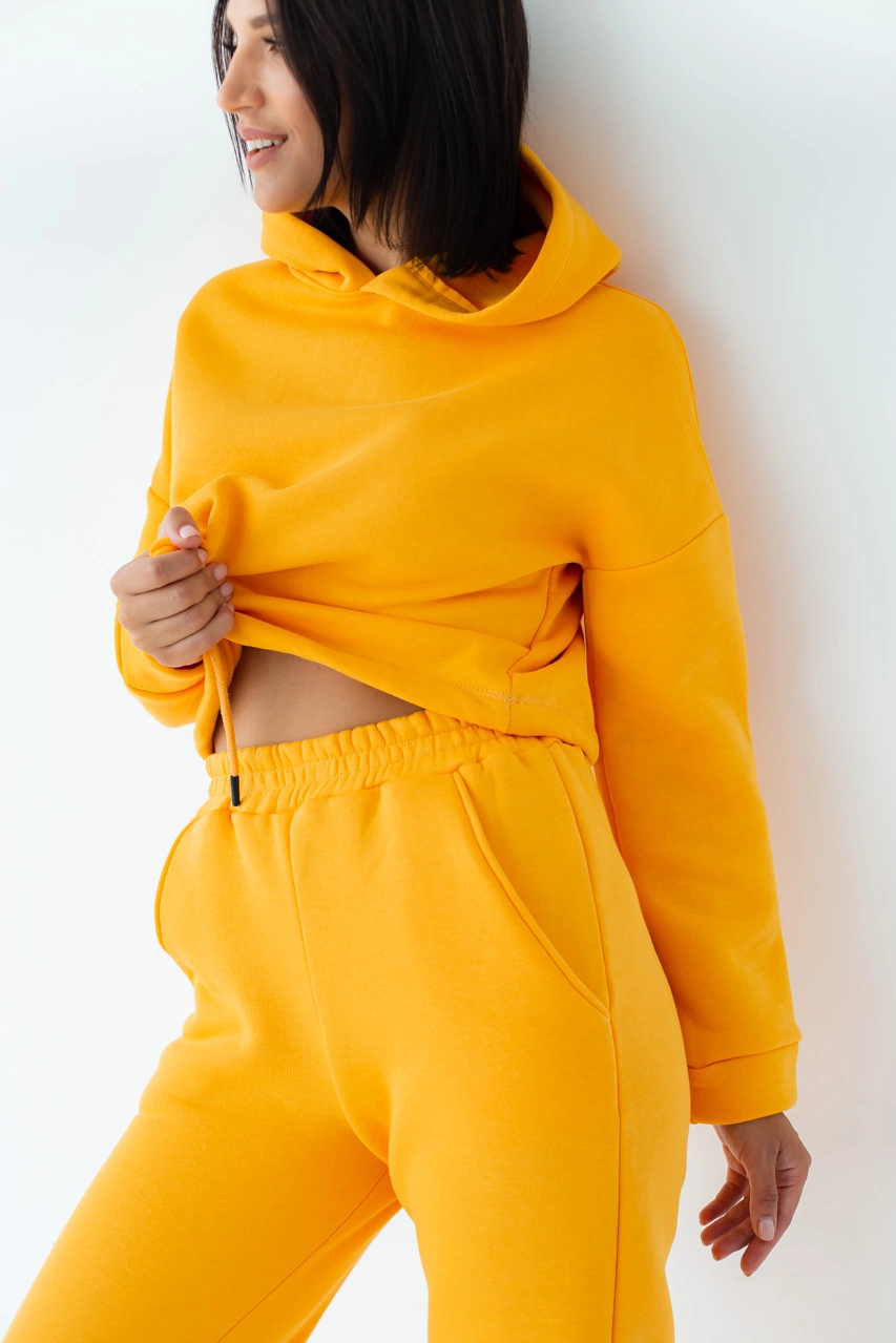 Женский спортивный костюм с капюшоном изготовлен из теплого футера с начесом. Комплект состоит из худи и джоггеров с боковыми карманами.