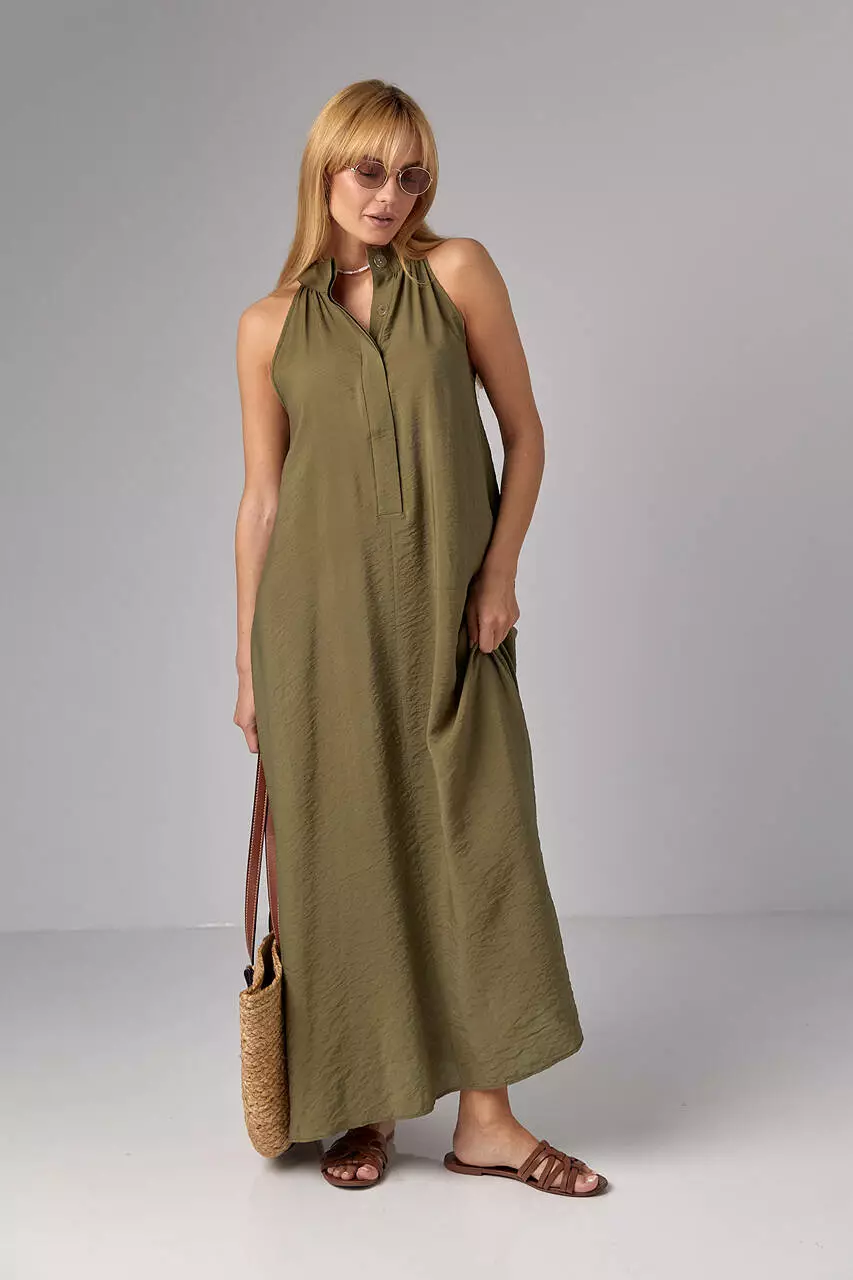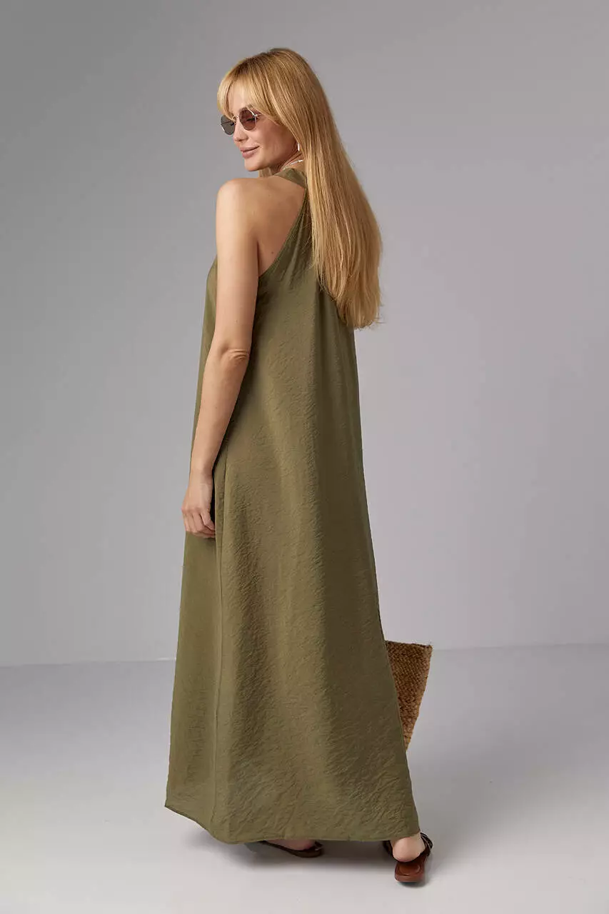 Модель длиной макси сшита из легкой ткани с жатой текстурой и