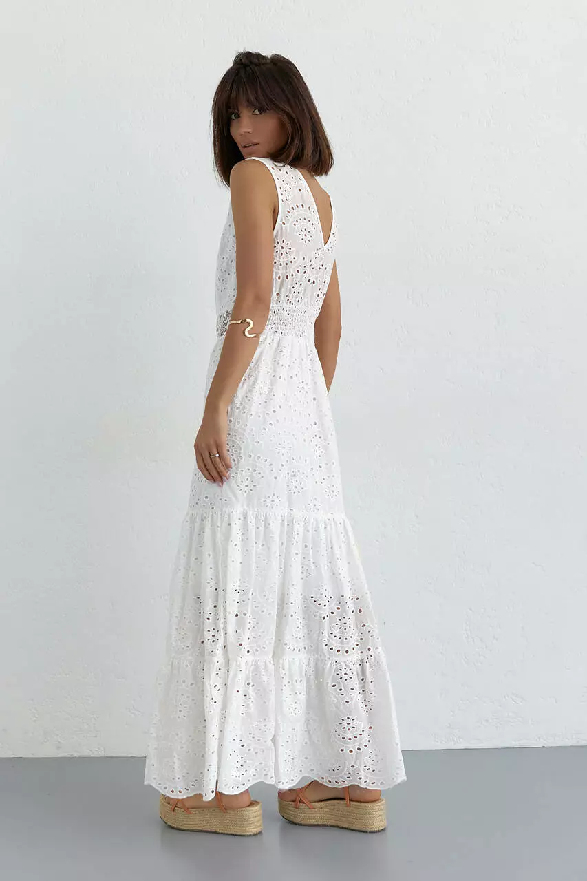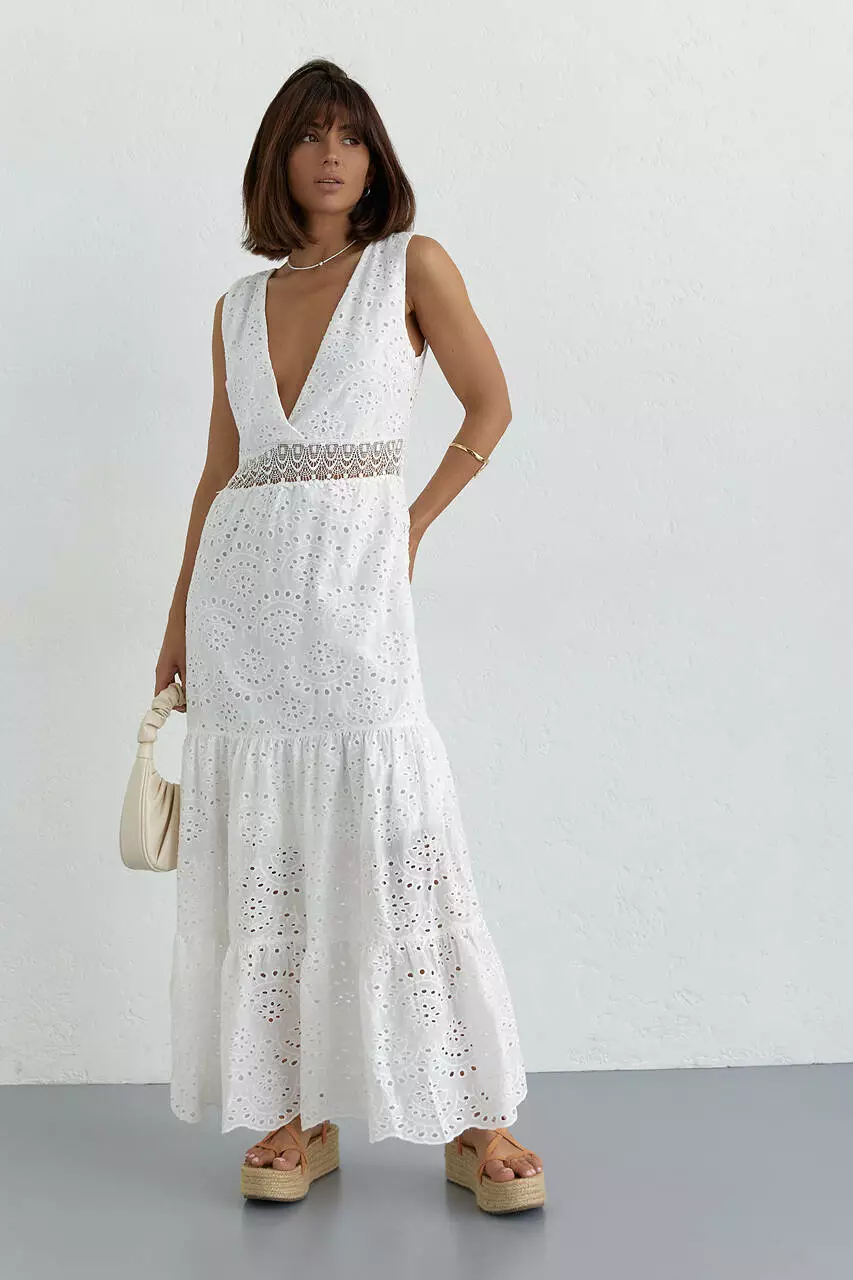 Длинное платье из прошвы и кружевом на талии - белый цвет, 36р (есть размеры)