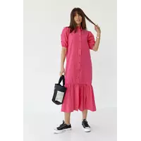В платьице короткие рукава-фонарики внизу собраны на манжет без резинки. Горловина круглая, с невысокой стойкой. Низ прямой, оснащен широкой оборкой.