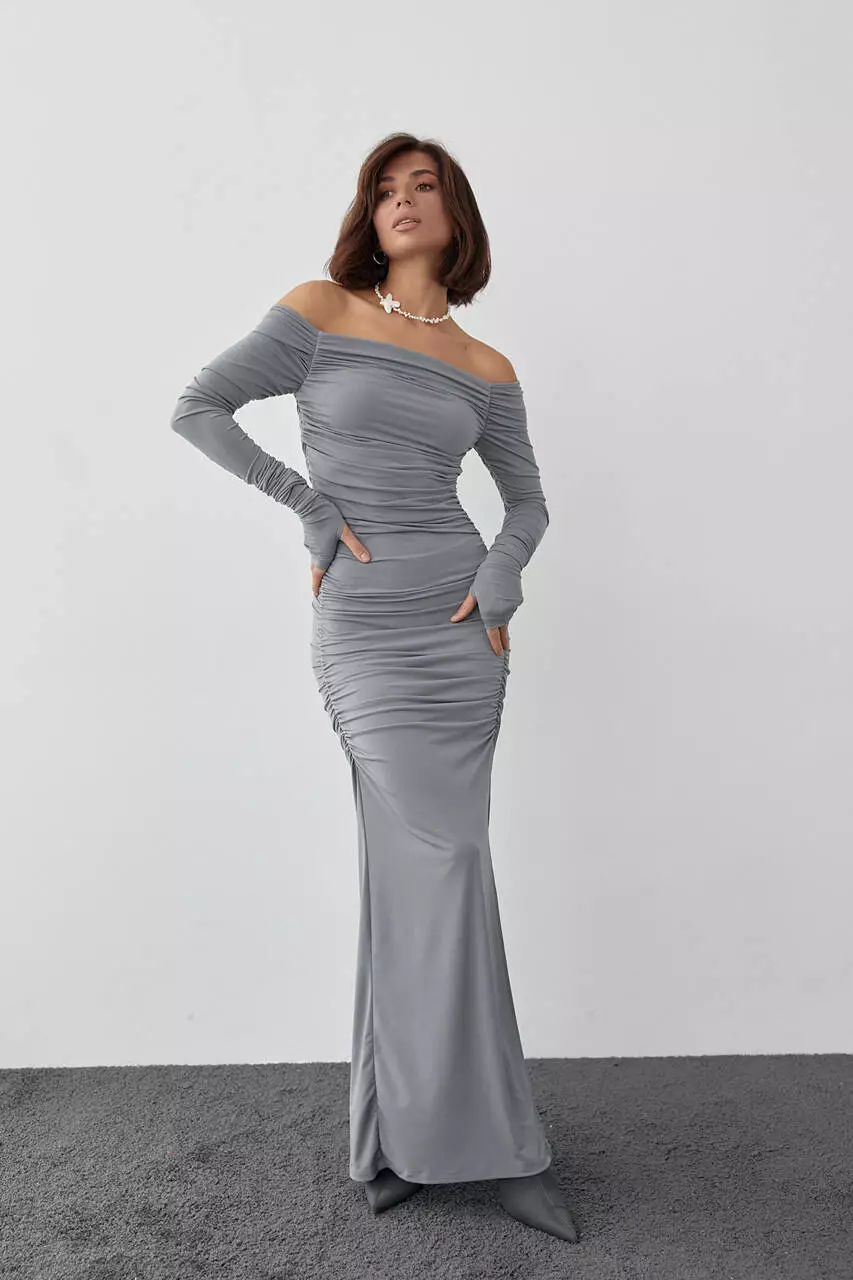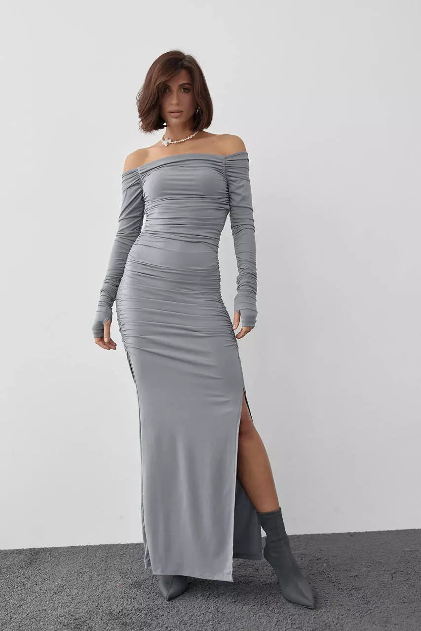 В модели длина макси и с левой стороны низ дополнен высоким разрезом.