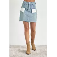 Модель имеет длину мини и прямые, необработанные края внизу.