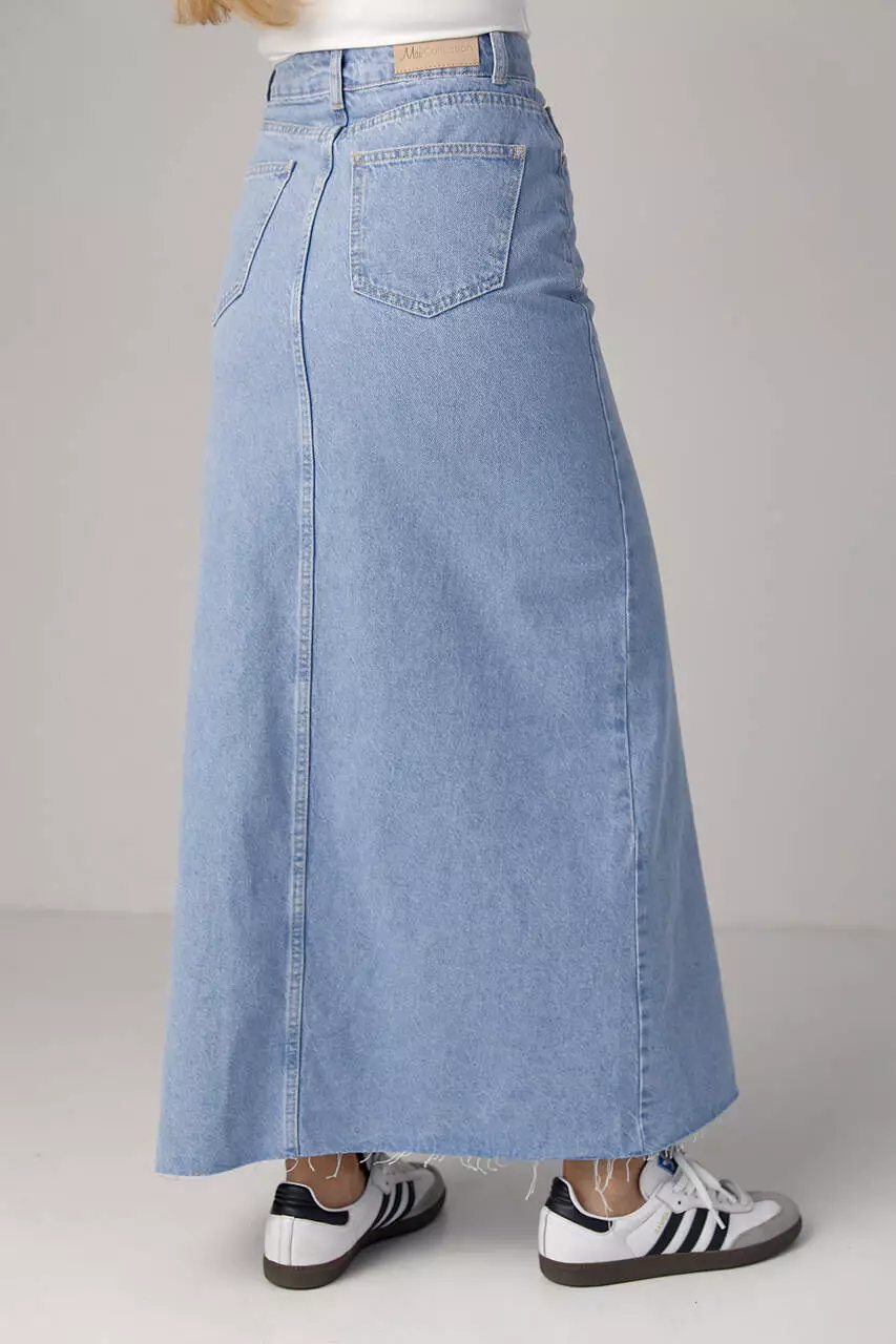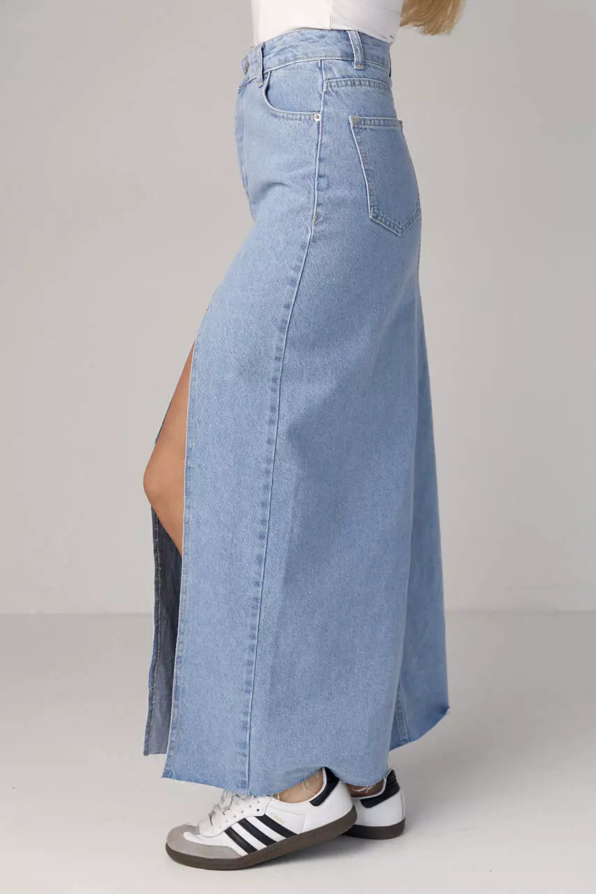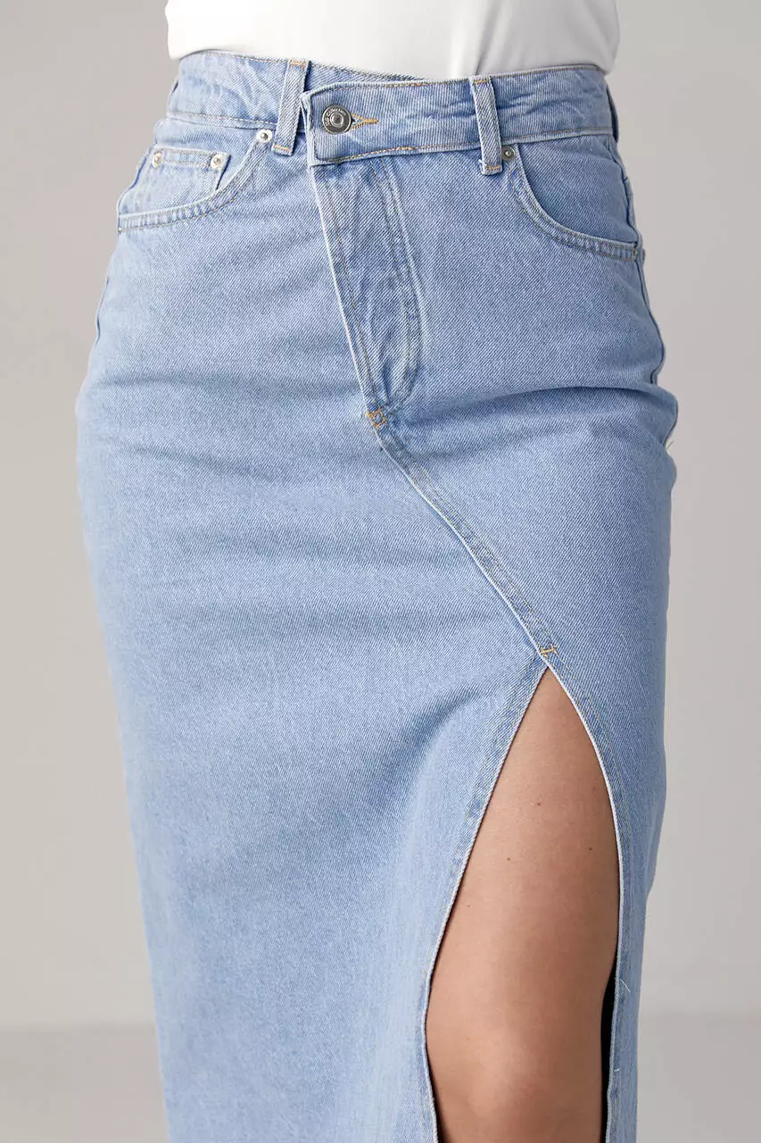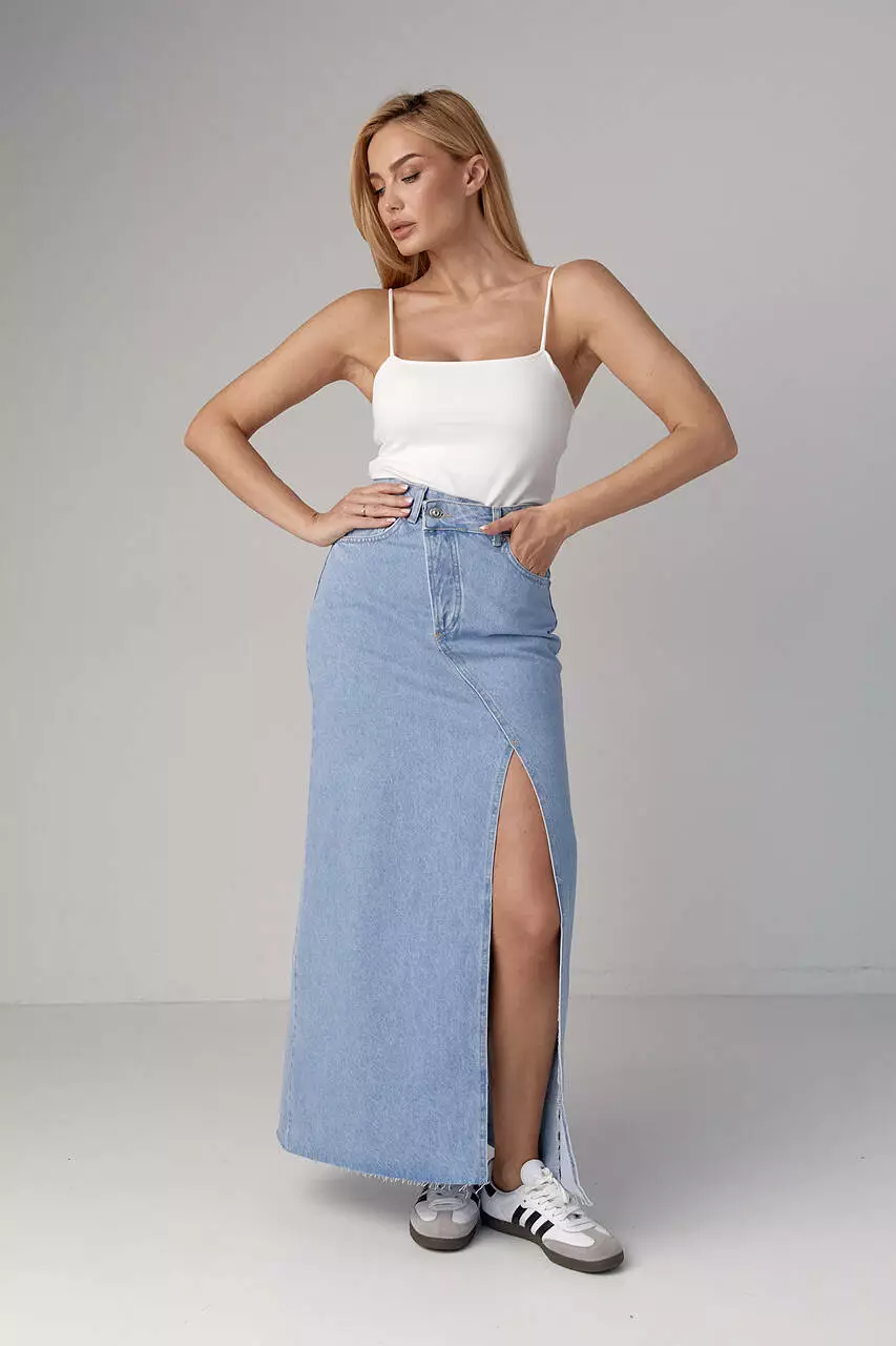 джинсовой юбкой с разрезом и боковым гульфиком. Она станет стильным