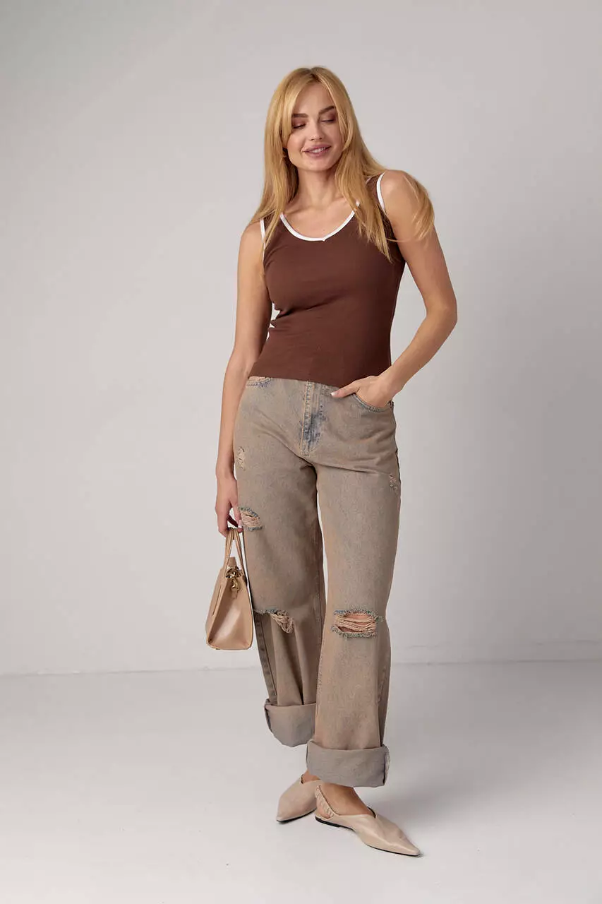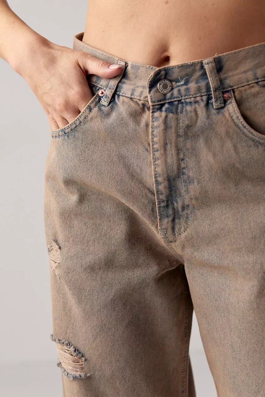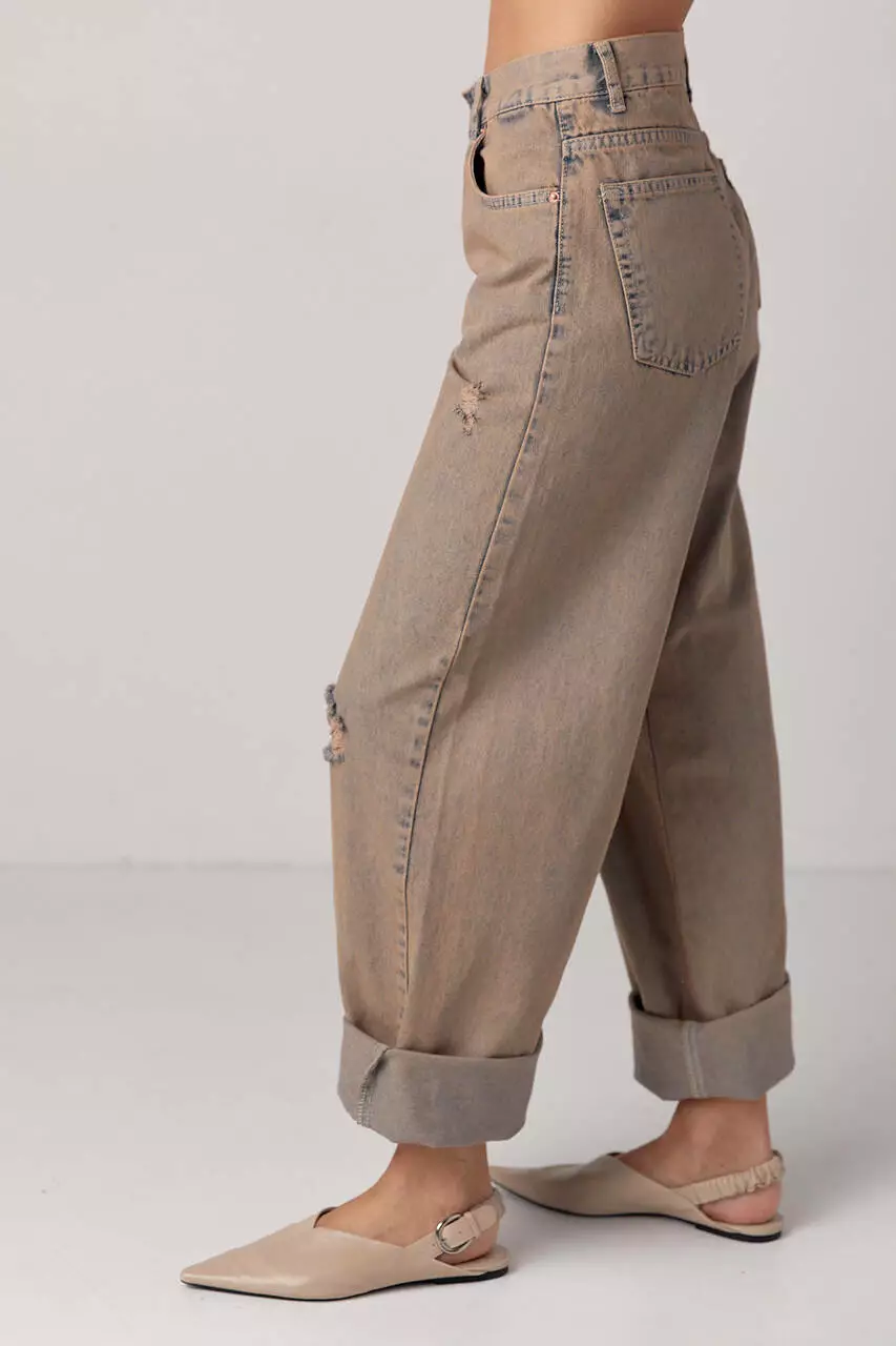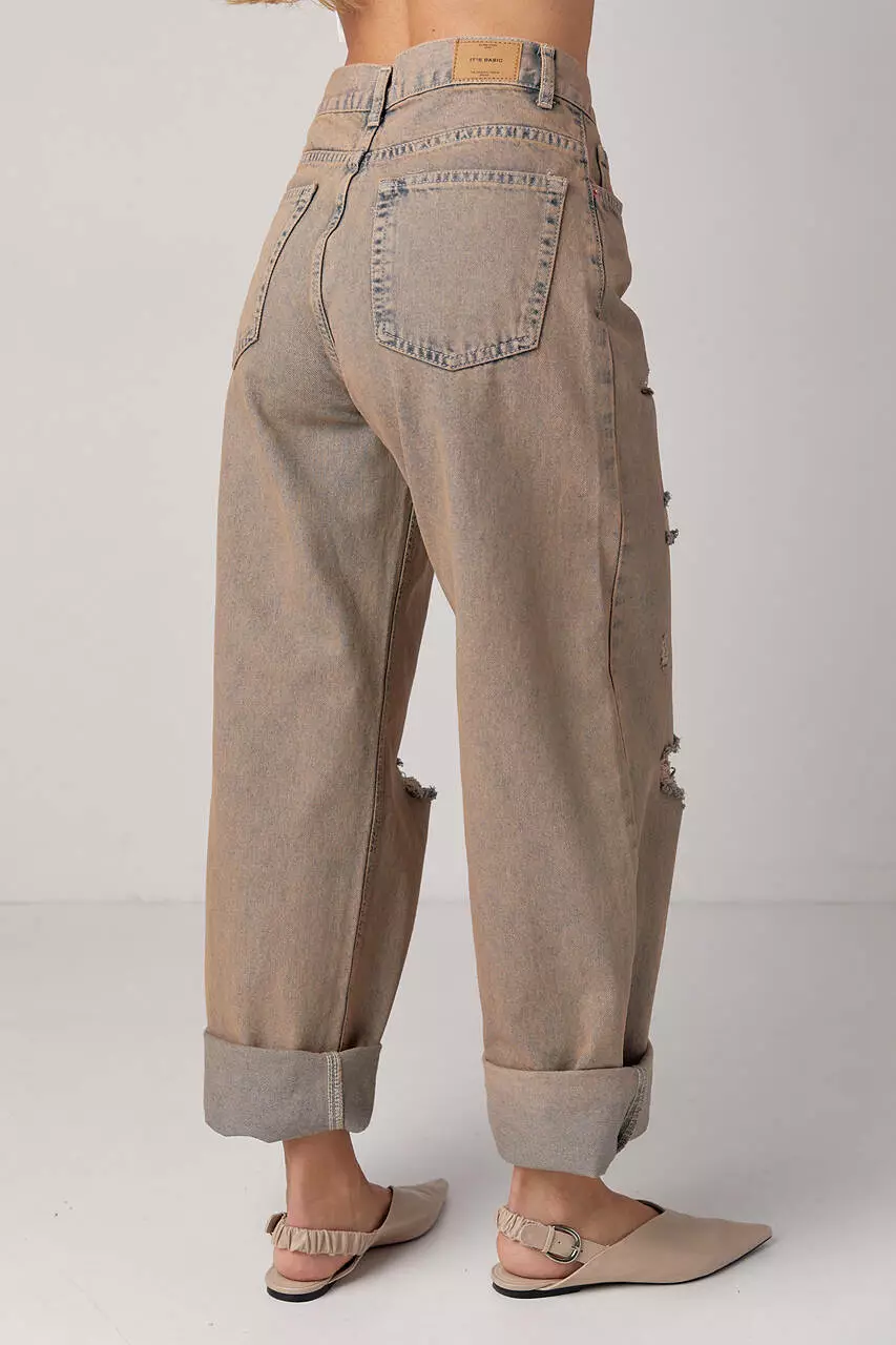 Эти женские джинсы baggy — воплощение стиля и беззаботности. Их широкий крой создает эффект свободы и комфорта, позволяя ощущать себя уверенно в любой обстановке. А передняя часть, украшенная рваными элементами, придает образу дерзости и непредсказуемости.