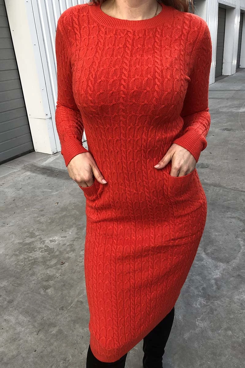 узором мелкой косички. Однотонное трикотажное платье имеет два