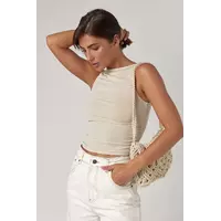 Модель без рукавов выполнена из эластичной ткани. Края низа прямые, горловина лодочкой.