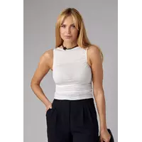 Модель без рукавов выполнена из эластичной ткани. Края низа прямые, горловина лодочкой.