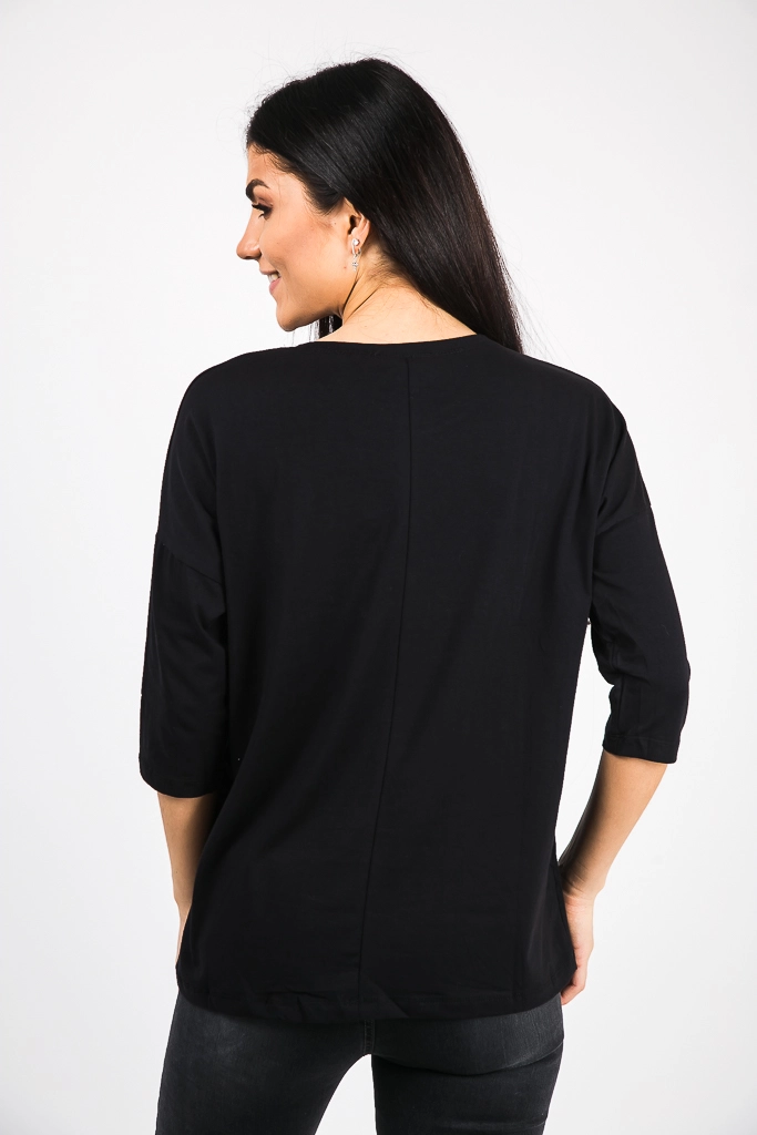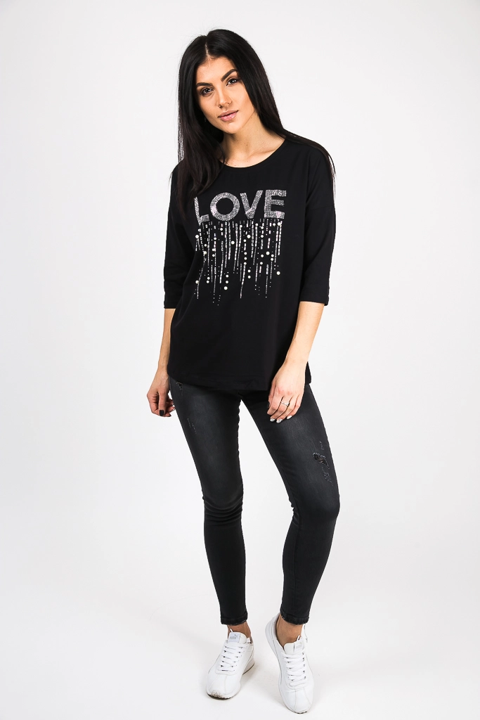 Похолодание - не повод отказывать себе в ярких красках, ведь одев футболку свободного кроя с четвертным рукавом под любимые джинсы и кеды, можно смело отправляться на прогулку с друзьями. На передней полочке принт слова "LOVE", декорированный мелкими стразами, под буквами ассиметричные полоски из прямоугольных страз и бусин.