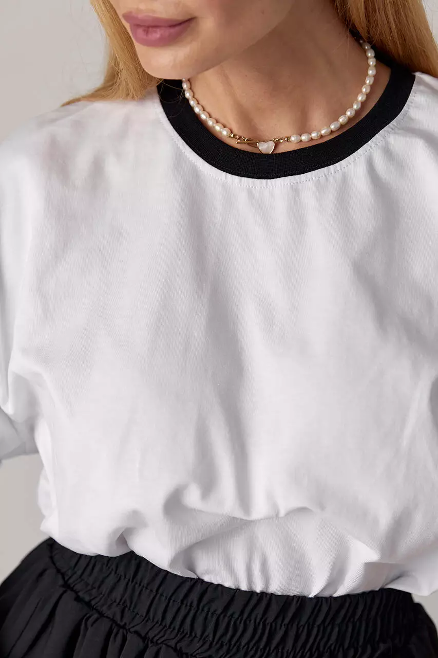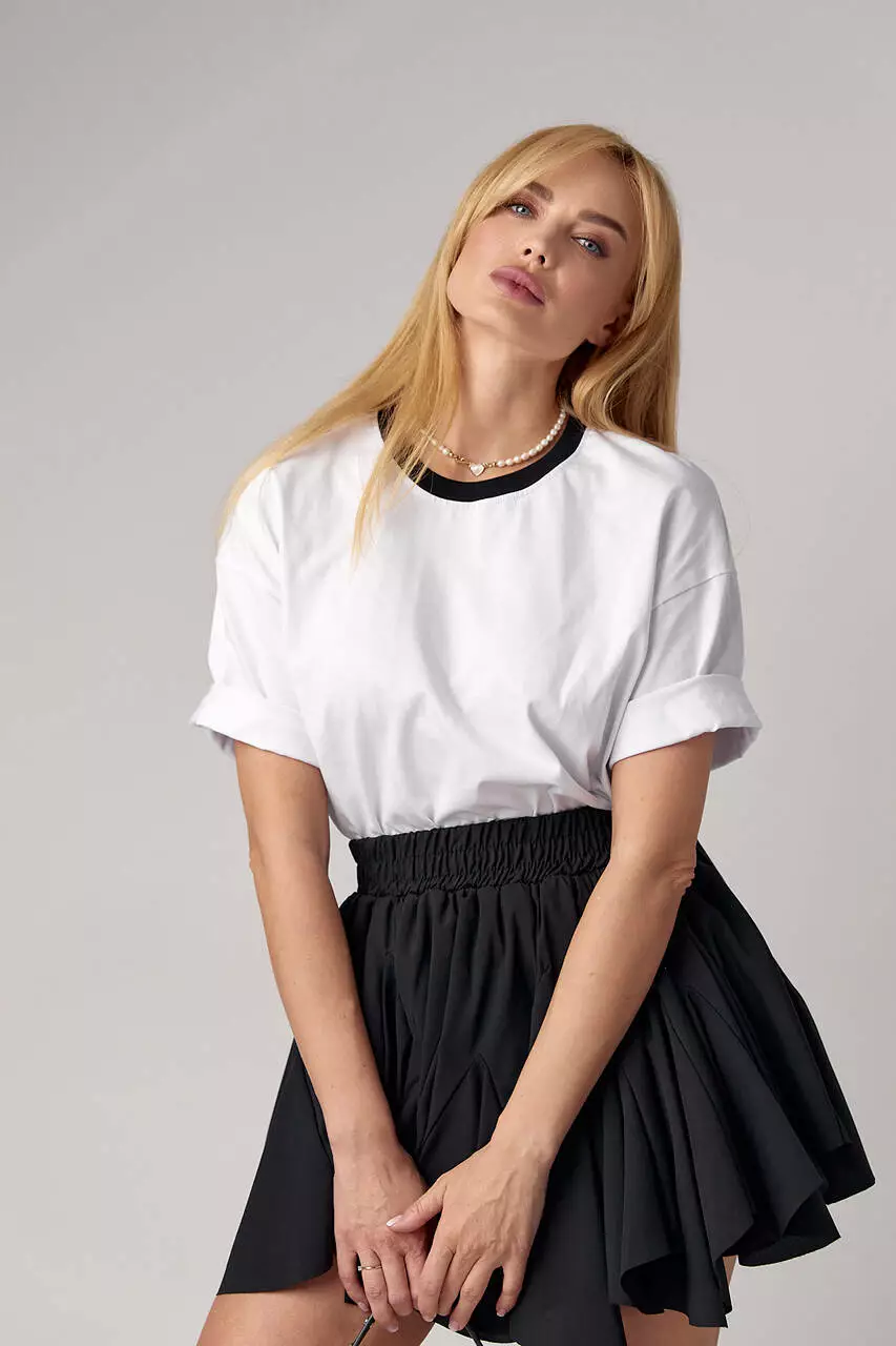 В этой модели круглая горловина обшита окантовкой контрастного цвета. Края низа в изделии прямые, рукава короткие.
