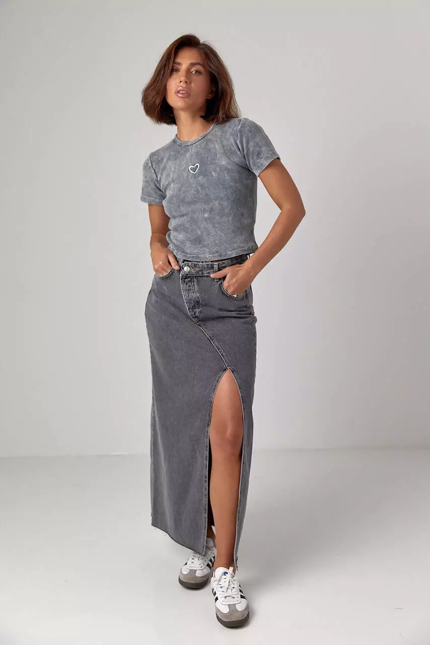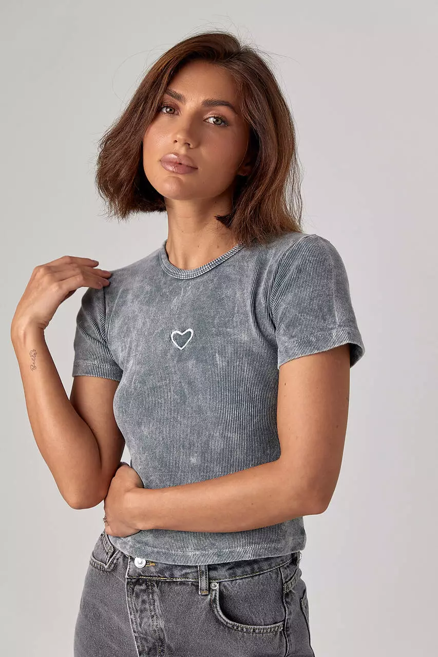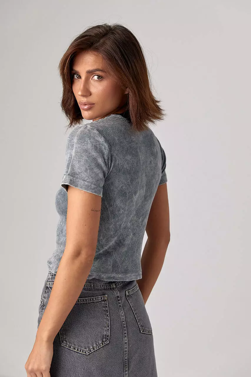 В этой укороченной модели с короткими рукавами края низа прямые,