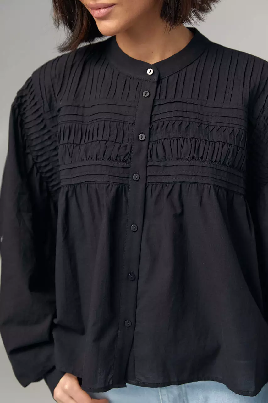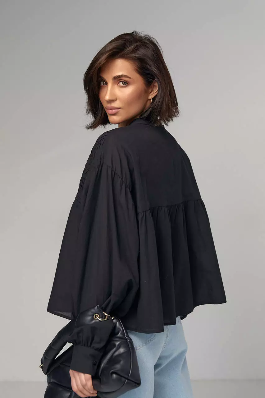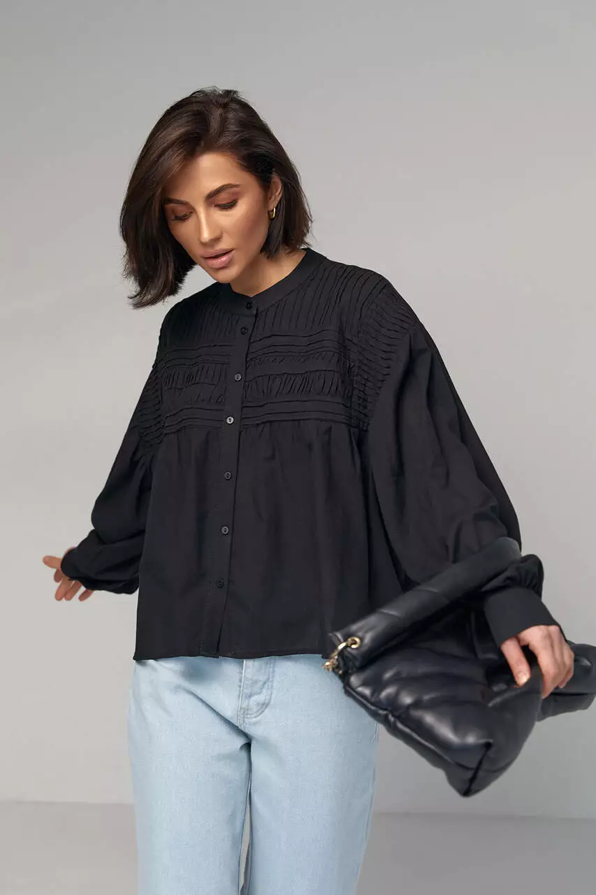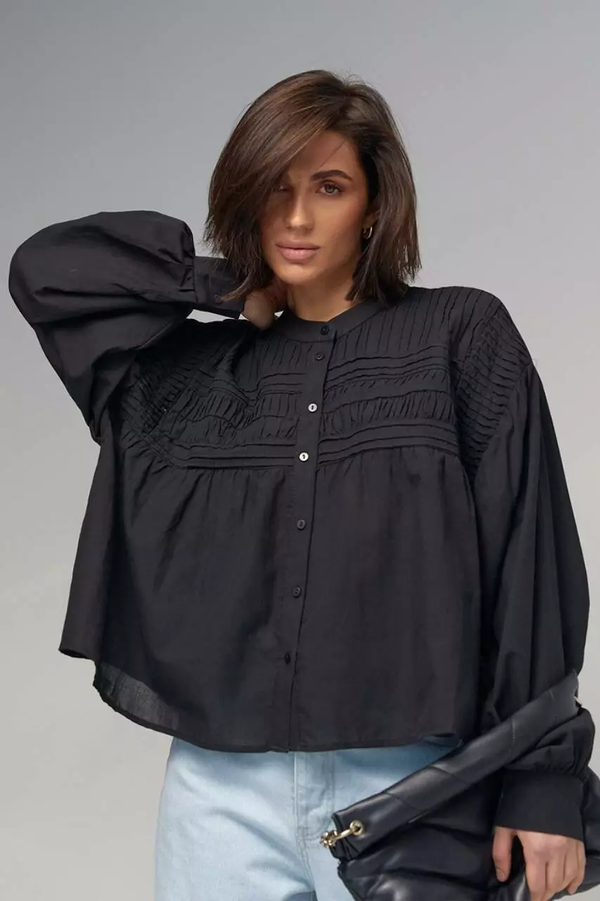В модели круглая горловина дополнена воротником-стойкой. Широкие рукава собраны внизу на манжет с пуговичкой.