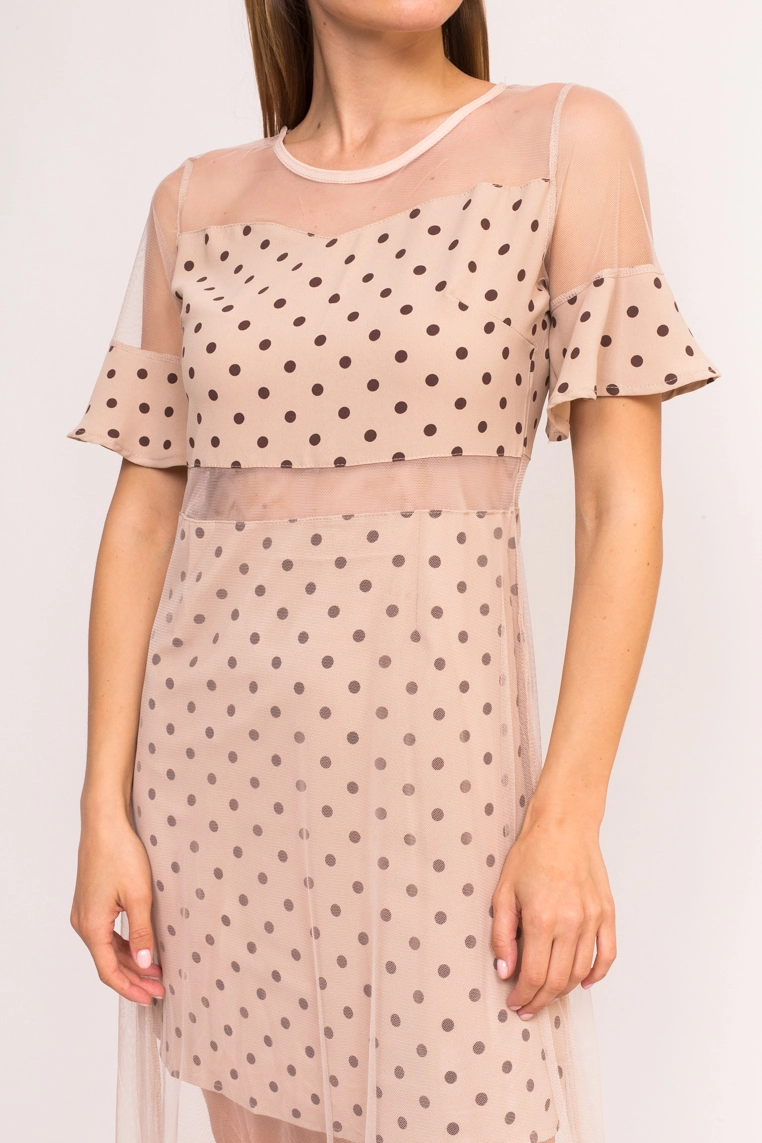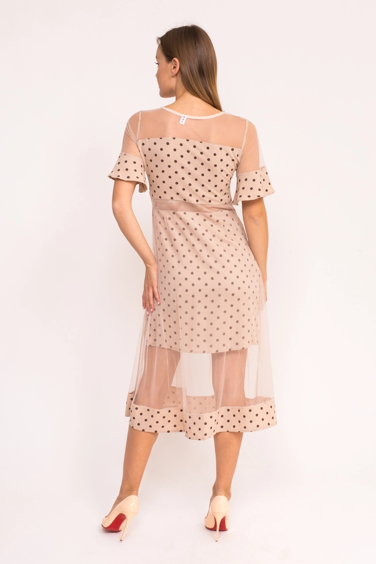 Красивое длинное платье в горох, станет гарантией вашего безупречного образа. Оригинальный рукав, верх которого выполнен из прозрачной сетки со вставкой из ткани, в народе такой рукав называют рукав-клин.
