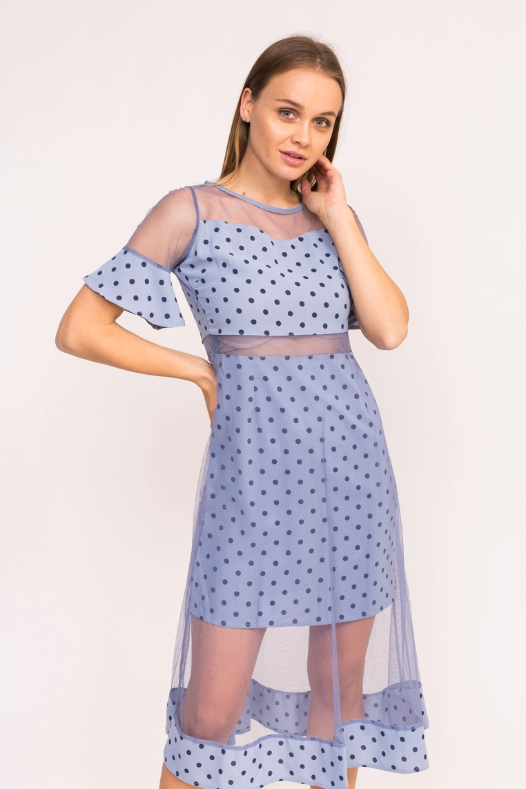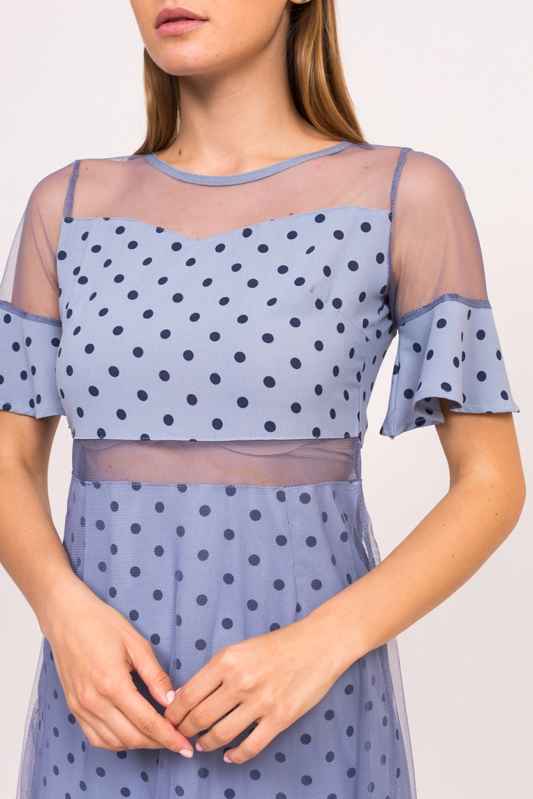 Красивое длинное платье в горох, станет гарантией вашего безупречного образа. Оригинальный рукав, верх которого выполнен из прозрачной сетки со вставкой из ткани, в народе такой рукав называют рукав-клин.
