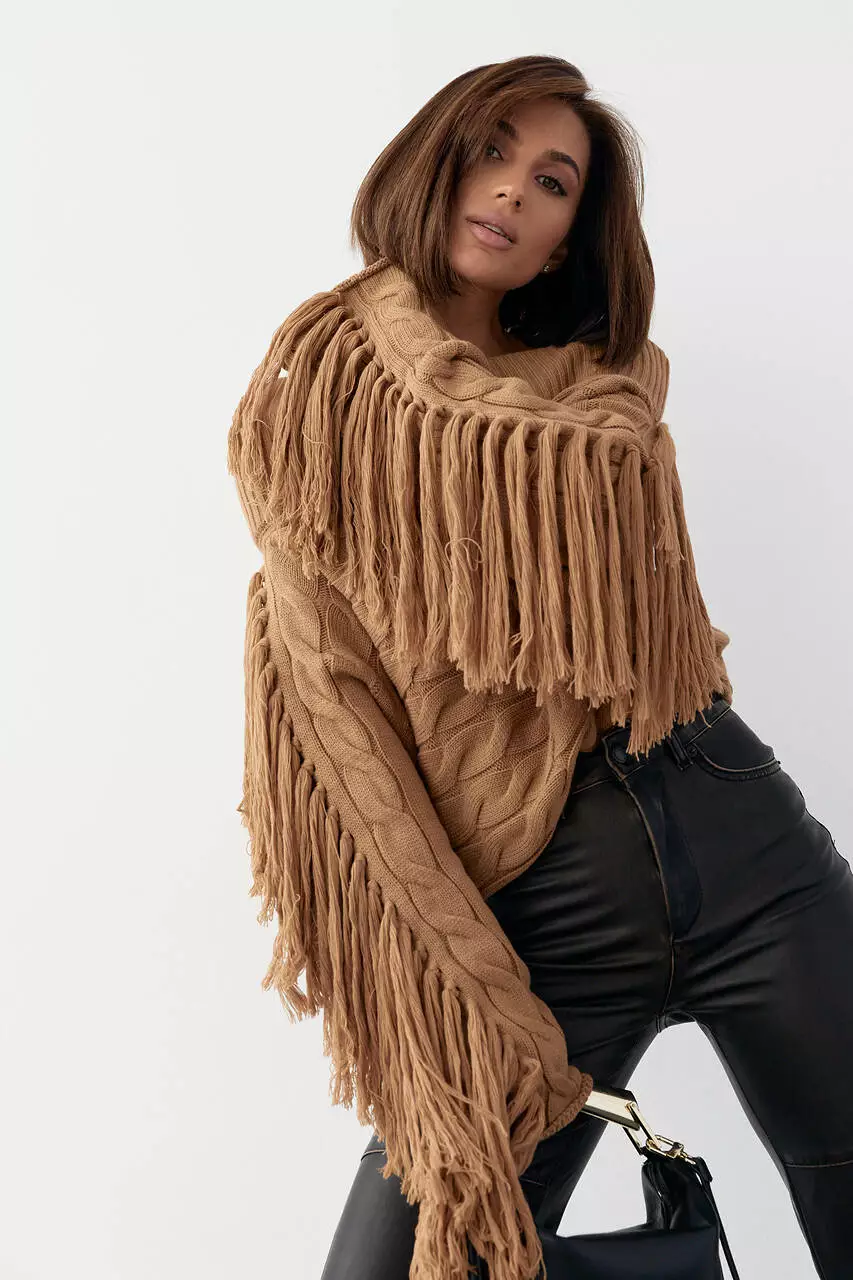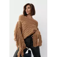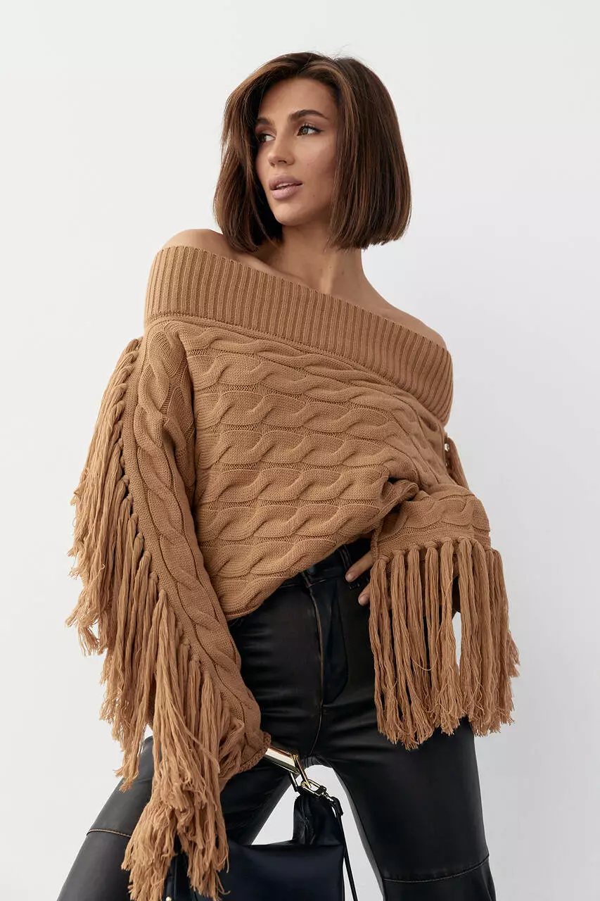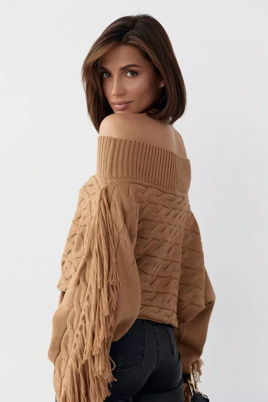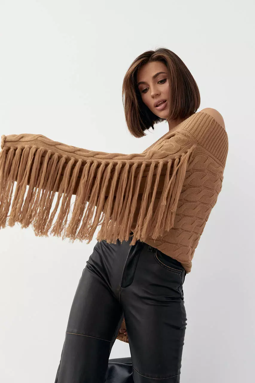 Укороченная oversize модель выполнена из крупной вязки в косички, с открытыми плечами и прямым низом. Длинные рукава по типу "летучая мишь" украшены бахромой.