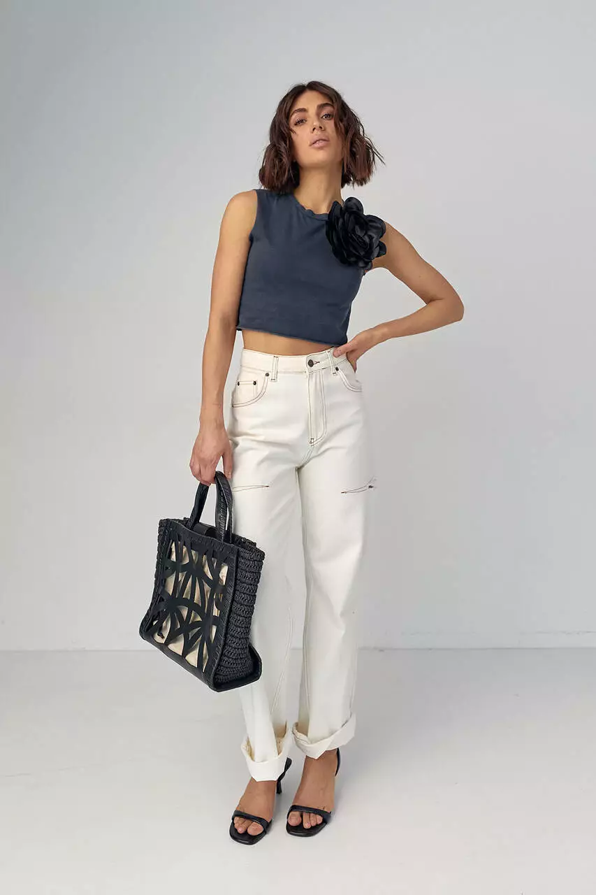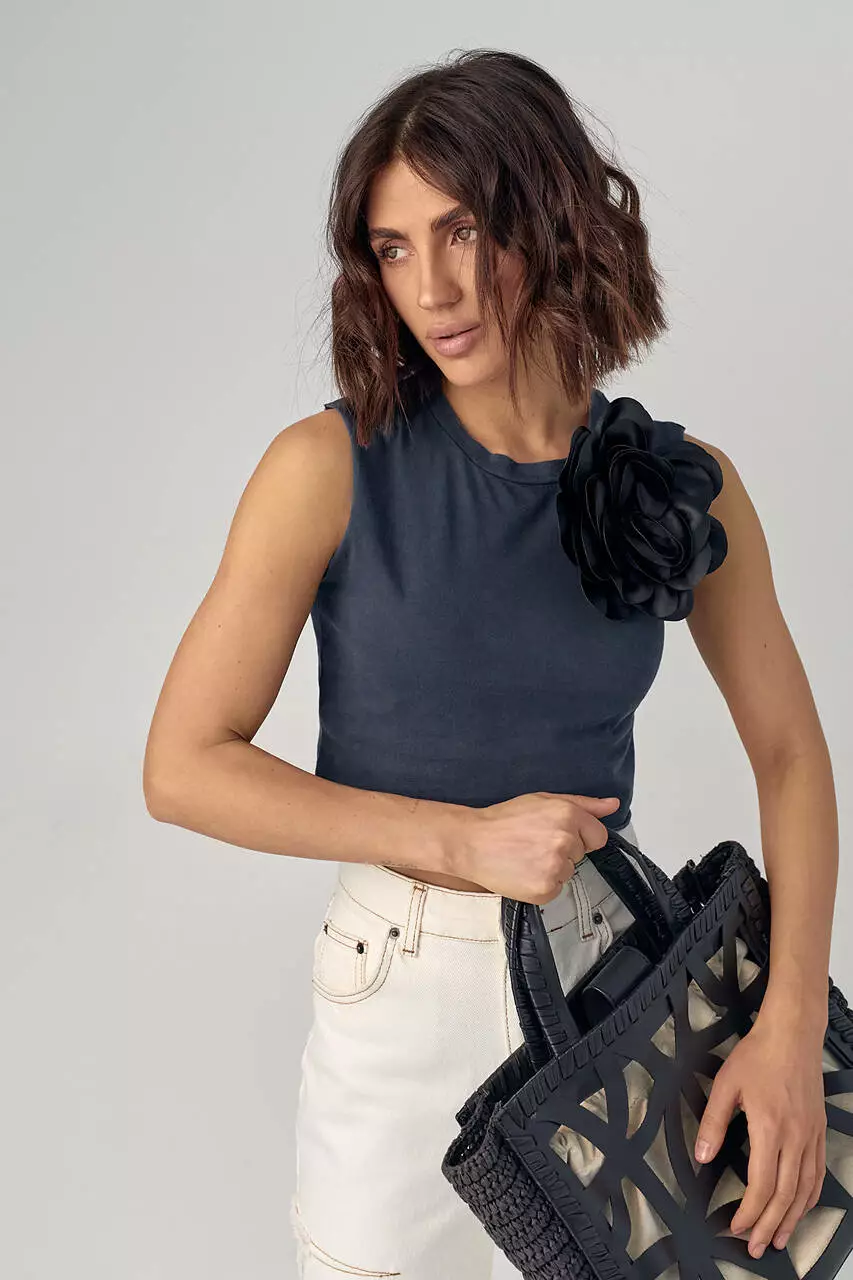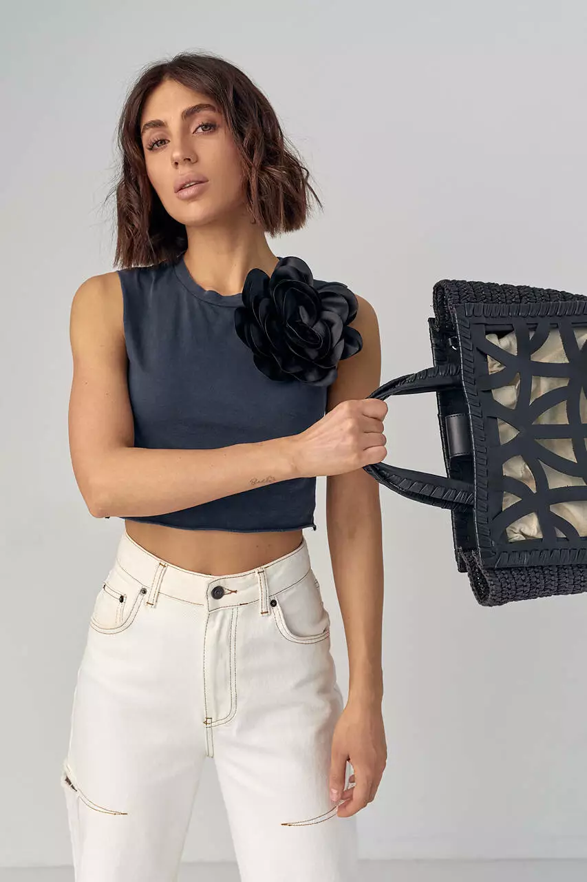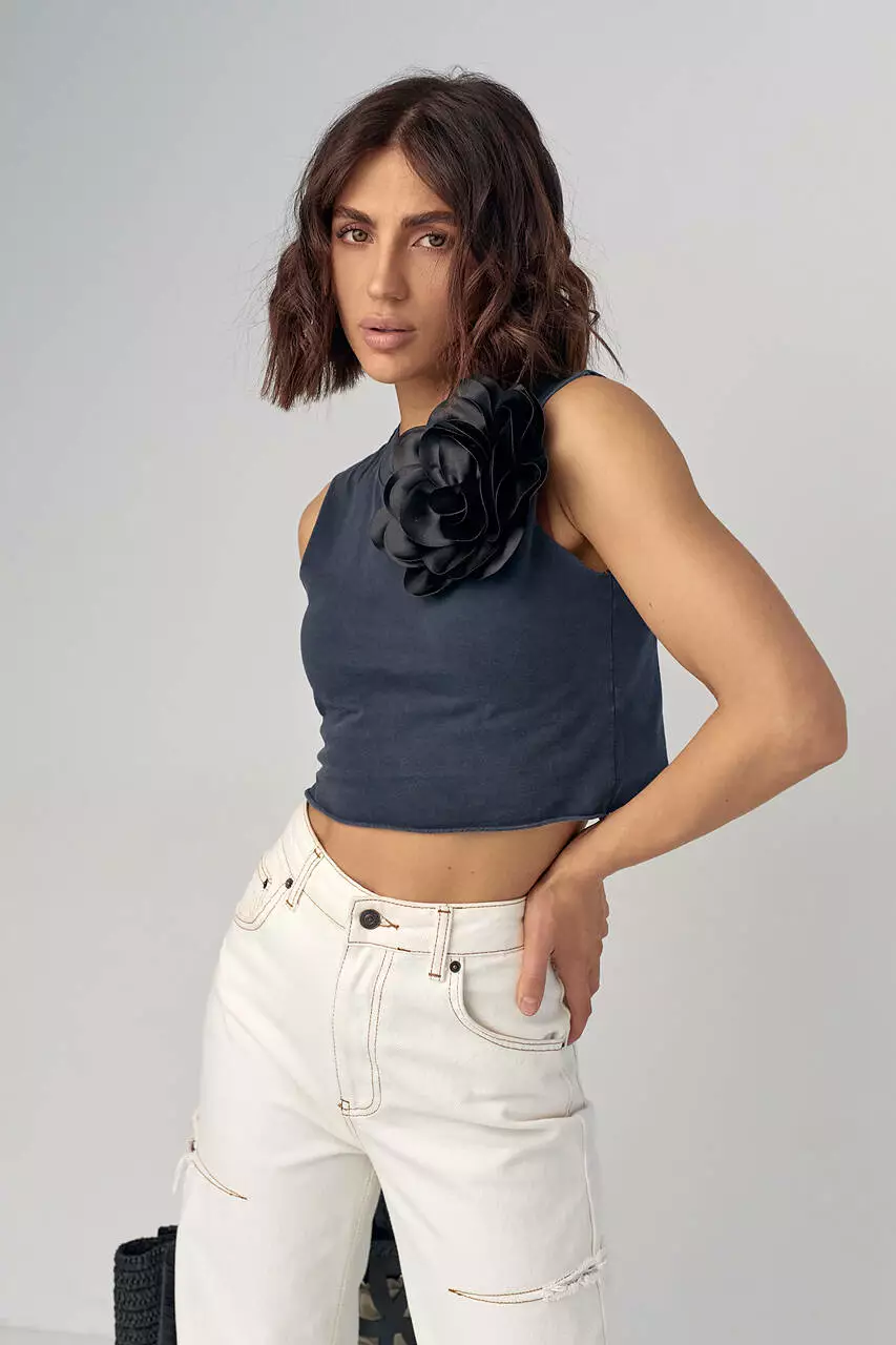 Короткая трикотажная майка-топ с объемным цветком - черный цвет, S (есть размеры)