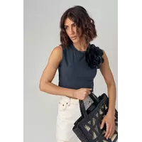 Эта майка прямого кроя из трикотажного материала - прекрасное сочетание комфорта и стиля. На передней части слева расположен объемный цветок, который придает изделию изысканность и уникальность.