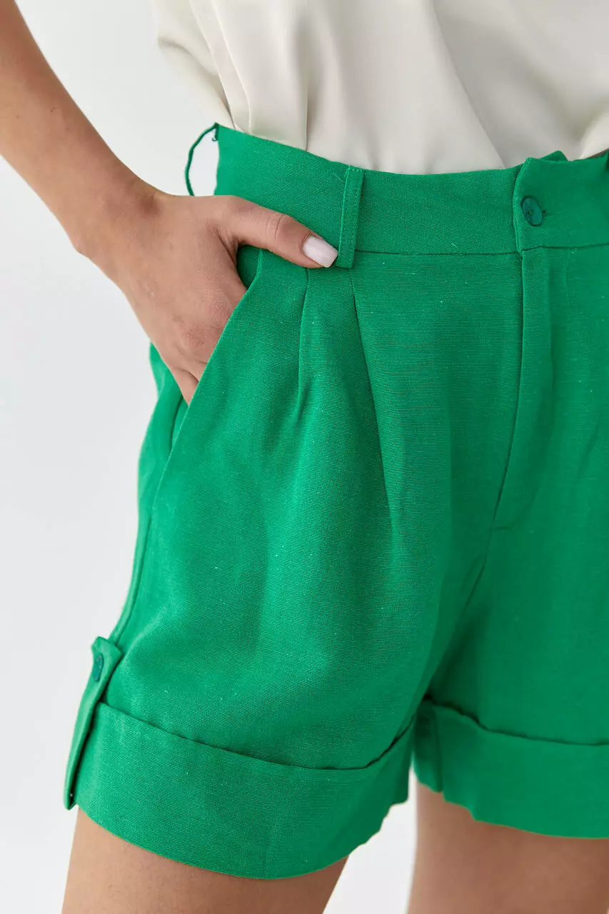 В шортиках края прямого низа украшены пристроченными отворотами и клапанами с пуговичкой по бокам.