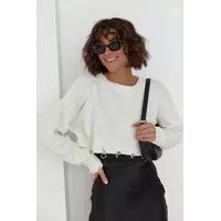 Эта модель привлекает внимание своим необычным декором в виде рваных элементов по низу длинных рукавов и прямого низа.