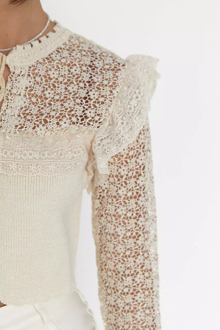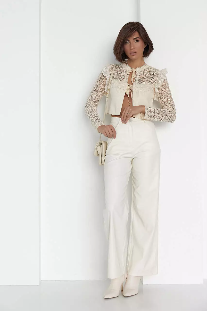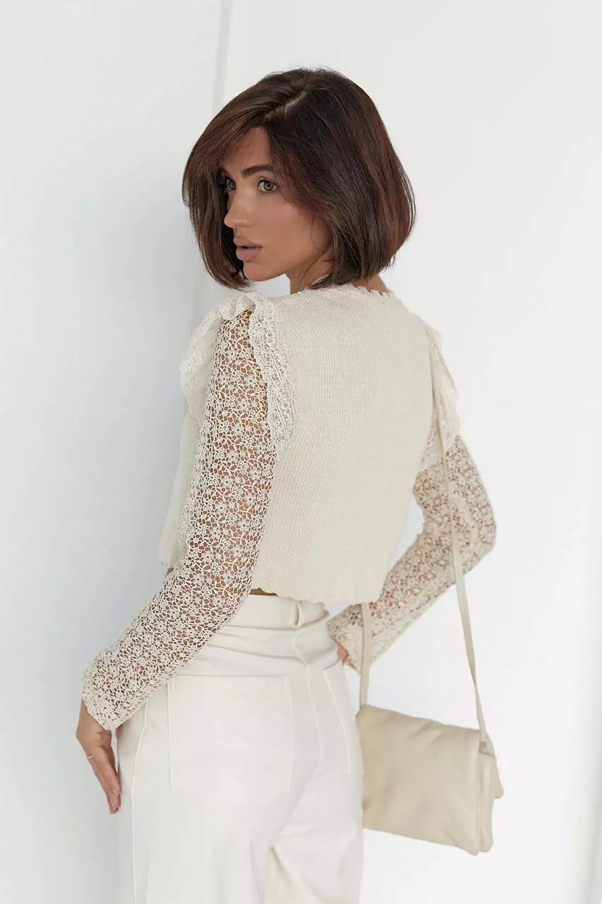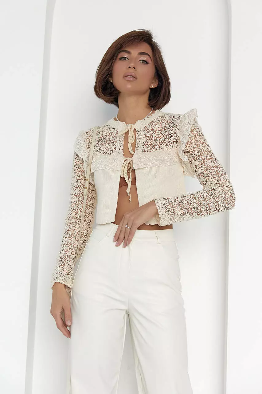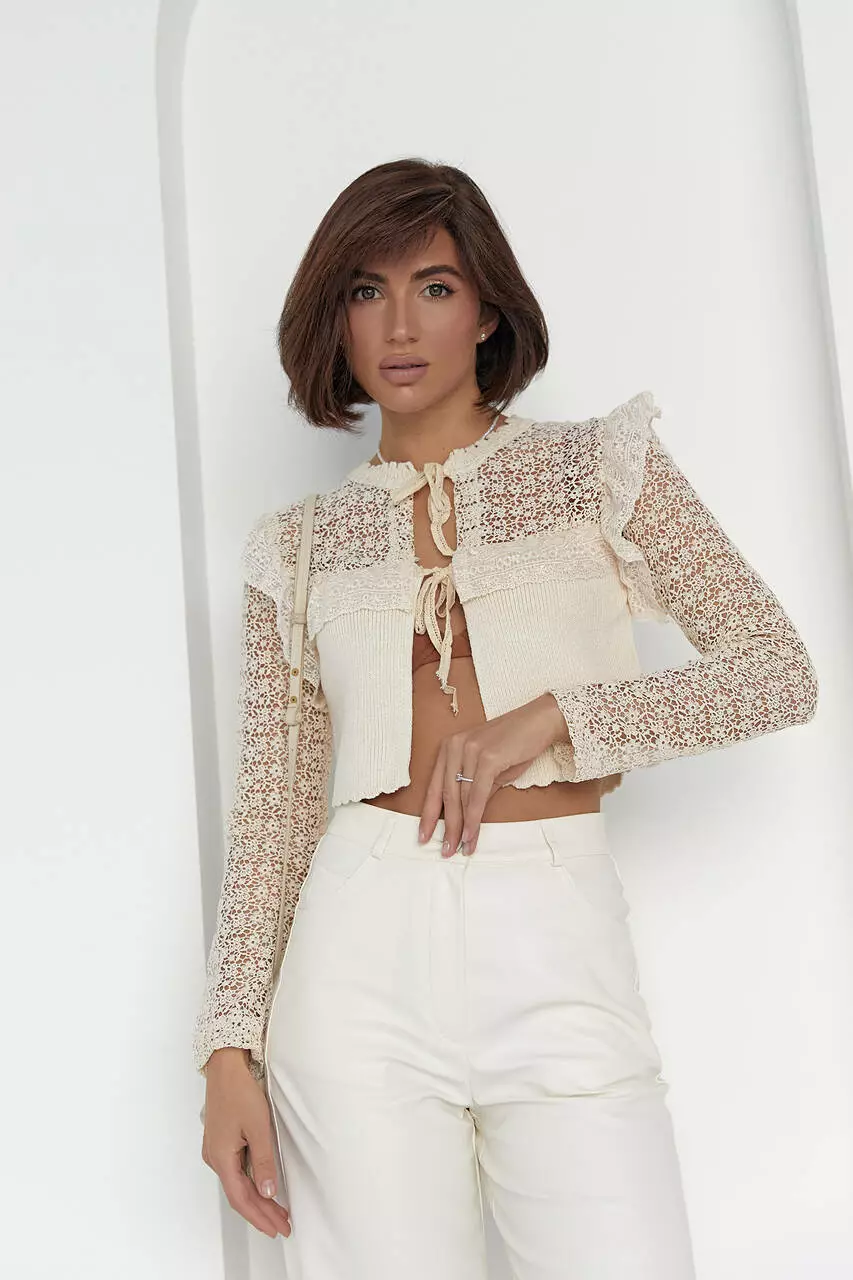 Хочешь создавать потрясающие модные и уютные образы - спеши приобрести вязаный кардиган на завязках с кружевом от LUREX! Эта укороченная модель с длинными рукавами идеально подойдет и под различные платья, и под джинсы или брюки.