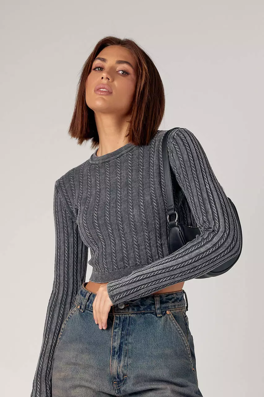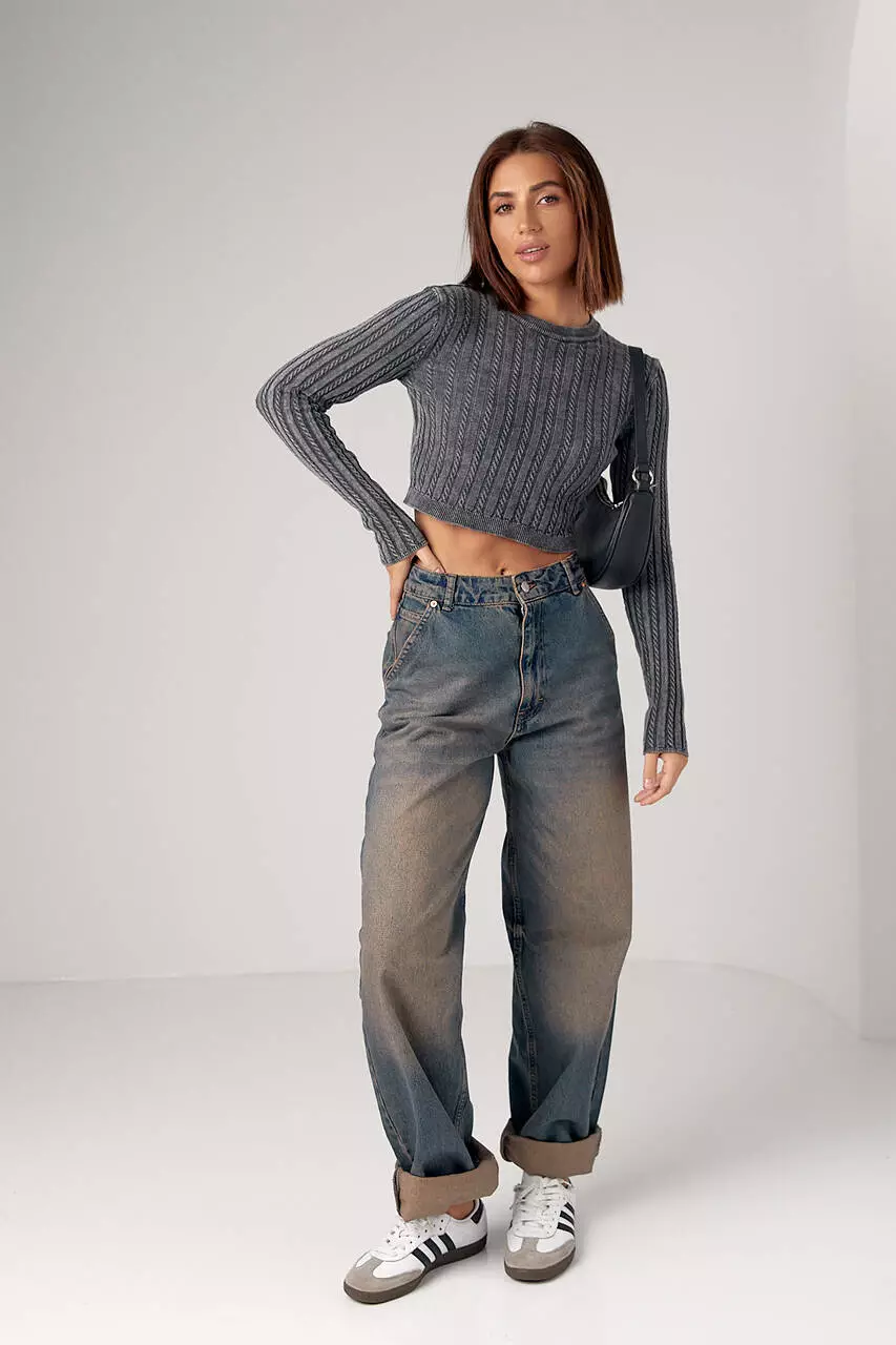 Короткий женский джемпер с узором в косичку - серый цвет, L (есть размеры)