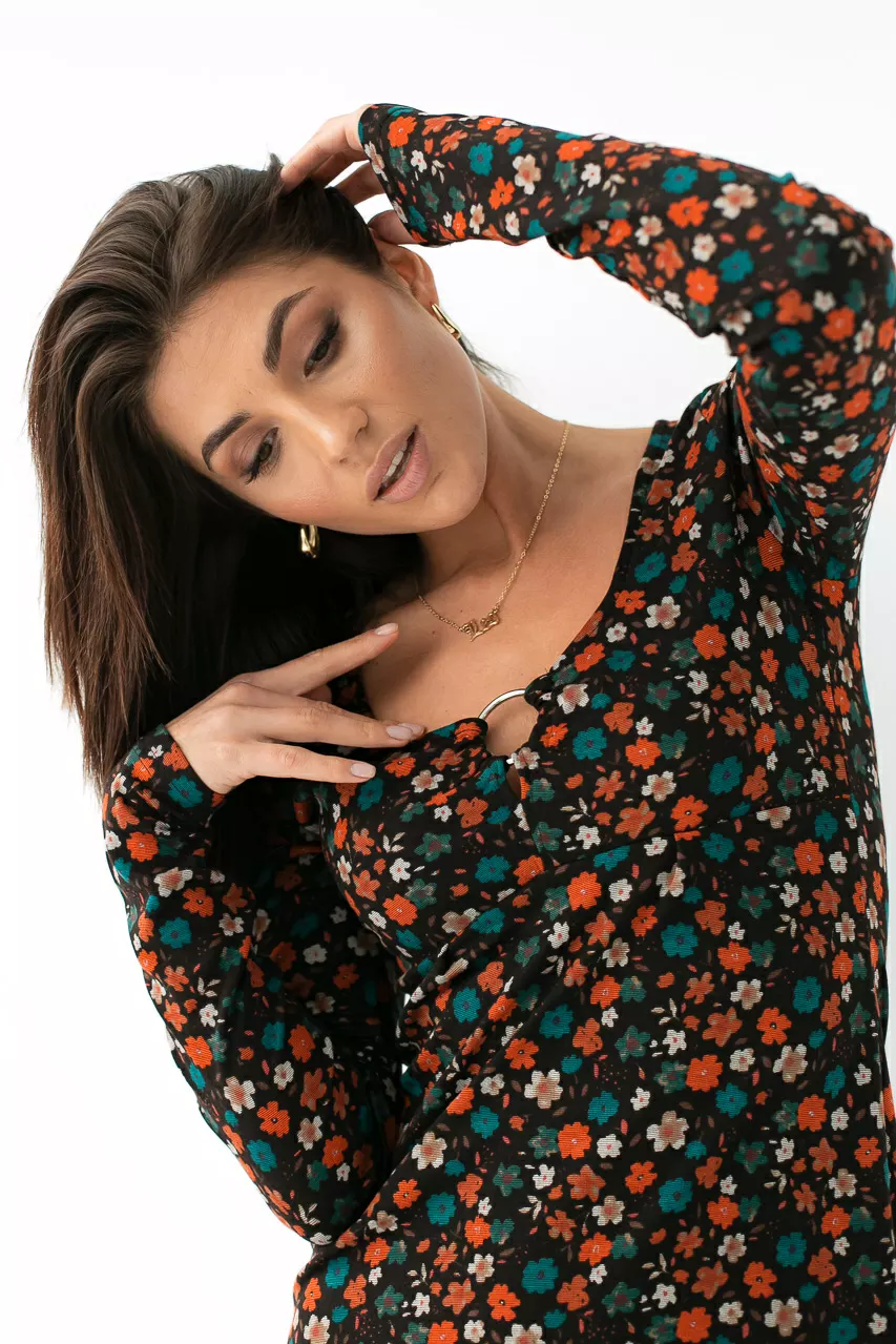 Оригинальное цветочное платье заслуживает тысячи комплиментов. Модель расширенного силуэта длинною миди, сшита из трикотажной ткани. Лиф - отрезной.