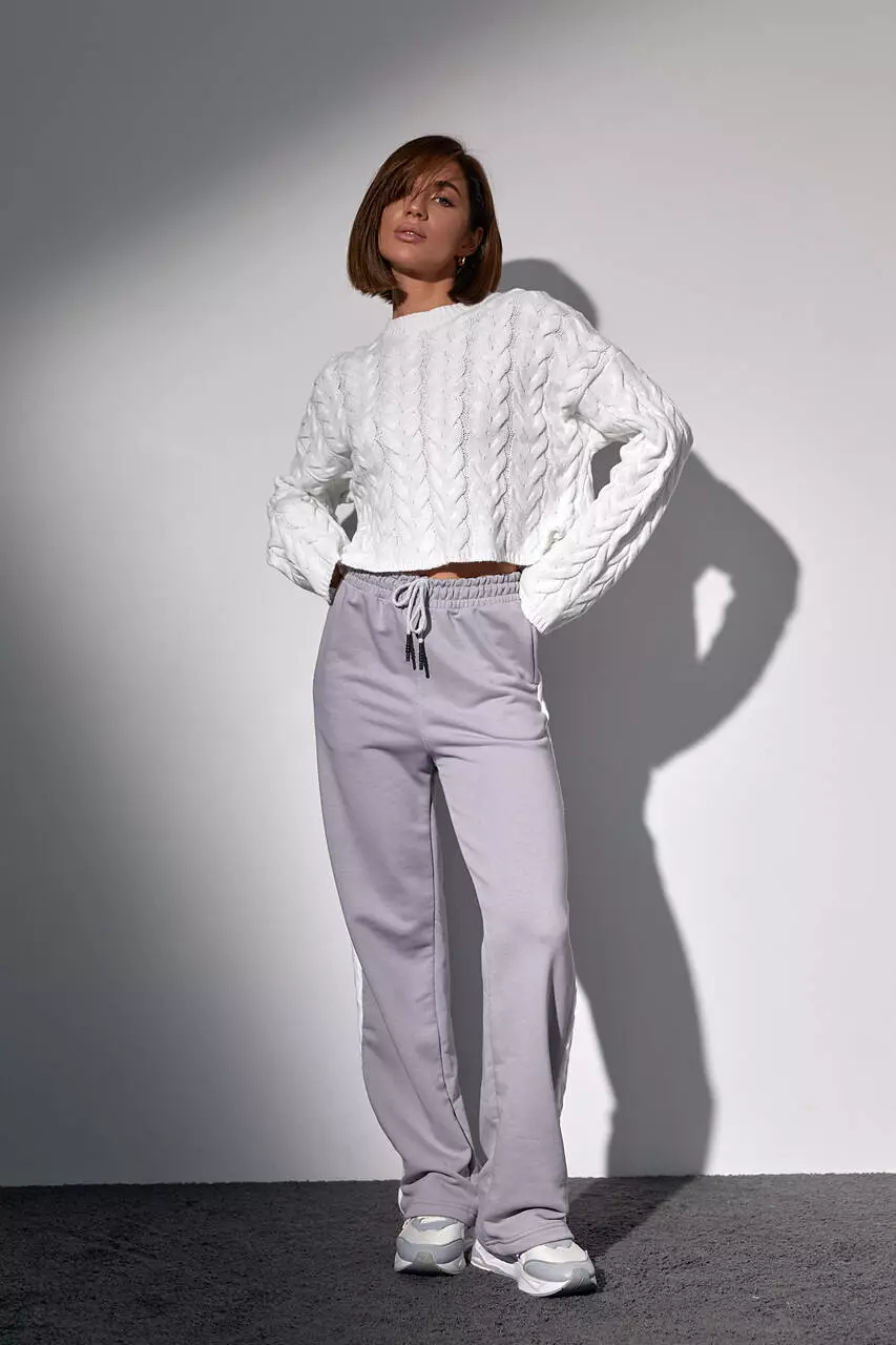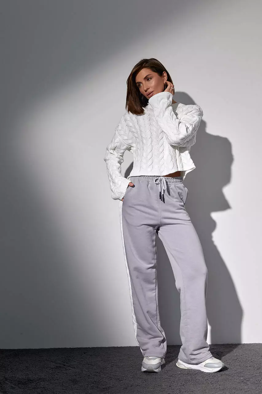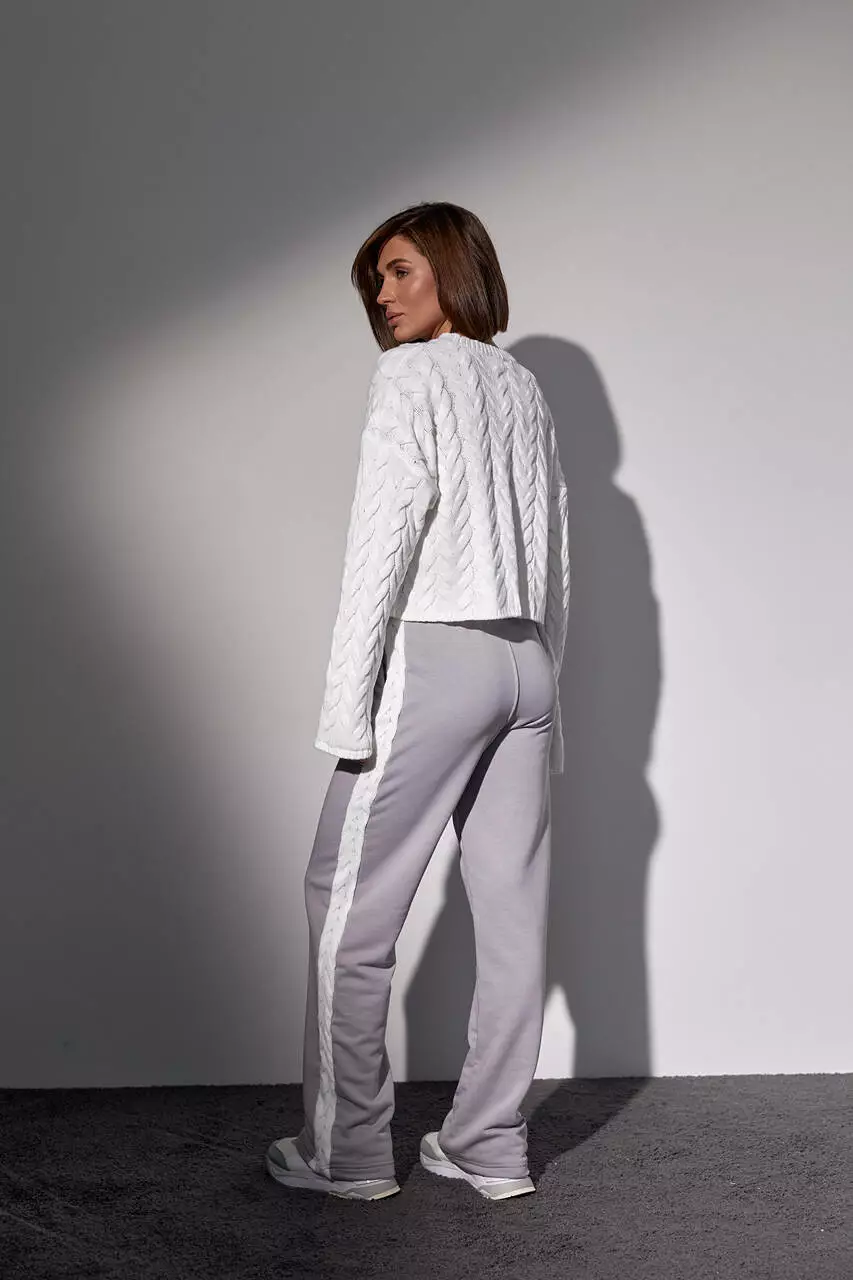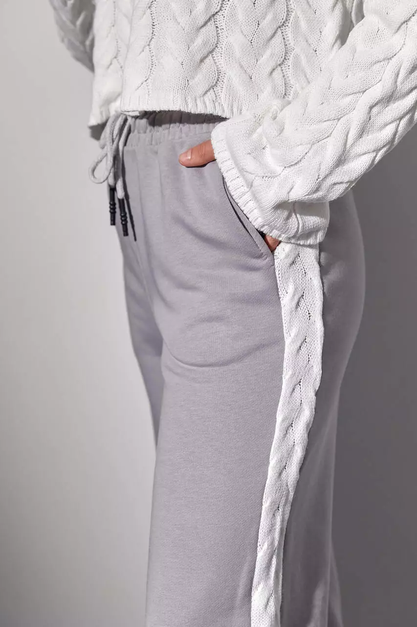 Костюм-двойка с вязаной кофтой в косички и трикотажными штанами - светло-серый цвет, M (есть размеры)