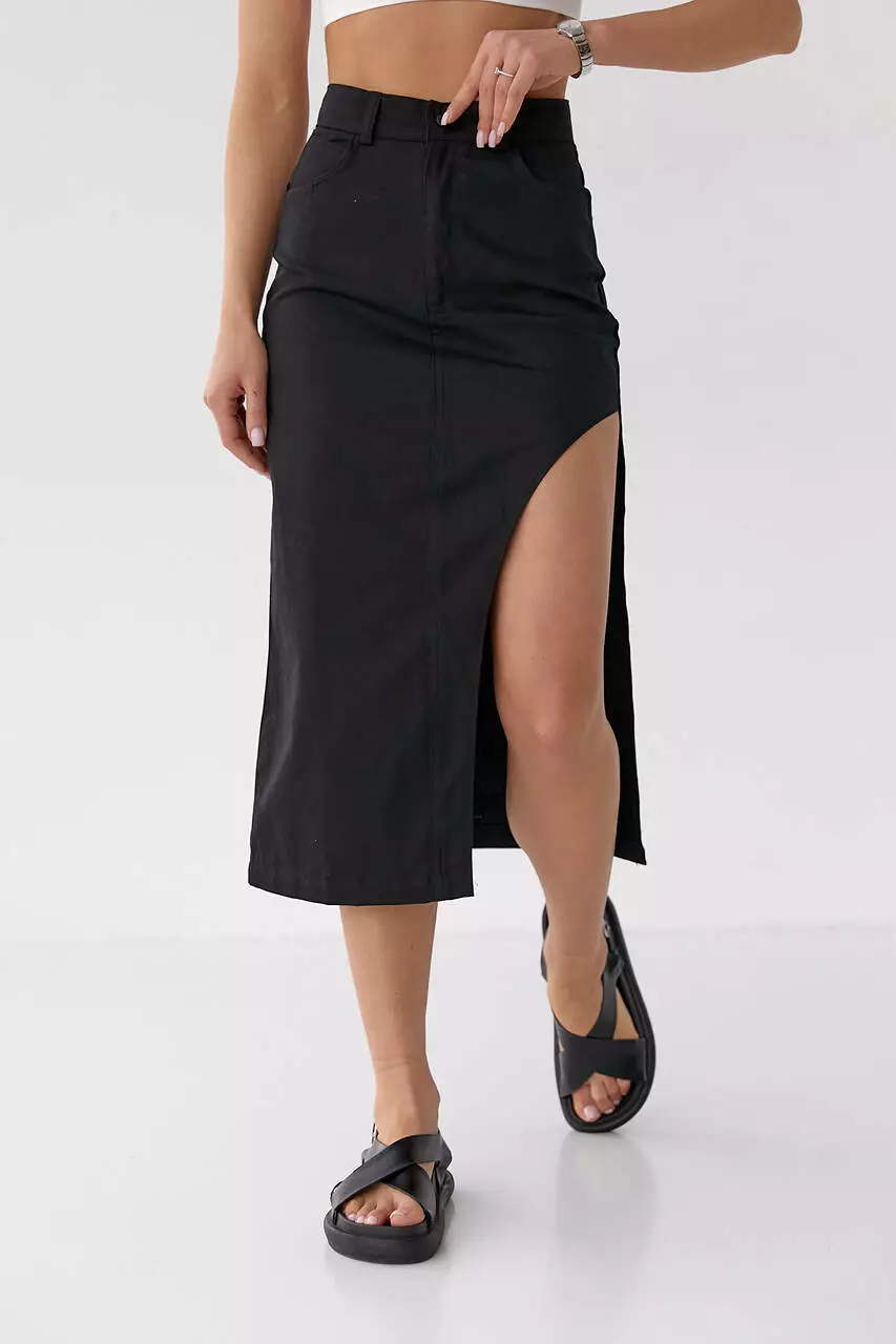 В модели края низа прямые.  С левой стороны внизу юбку украшает высокий вырез с полукруглым верхом.