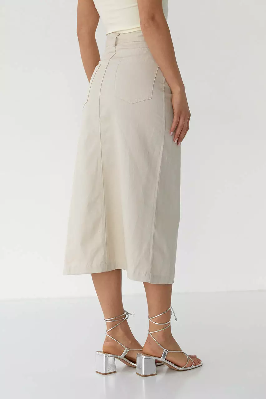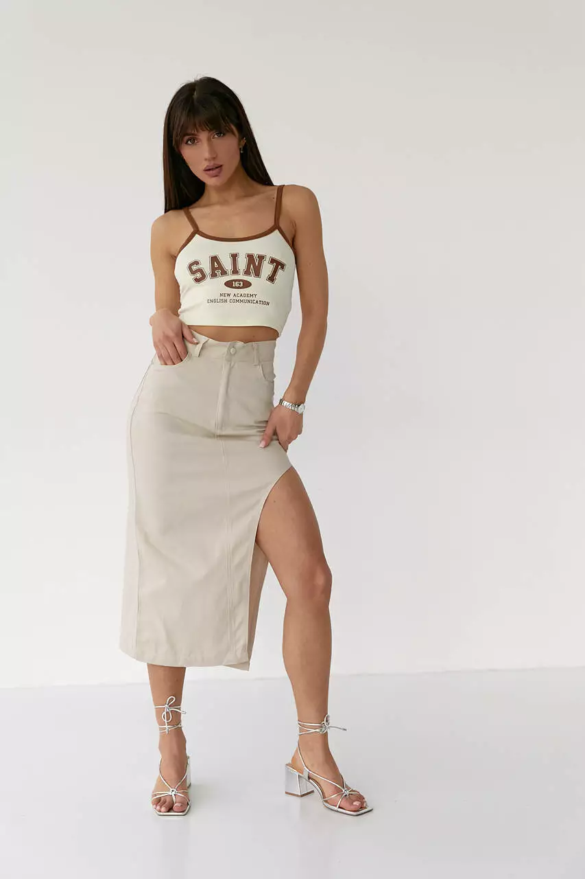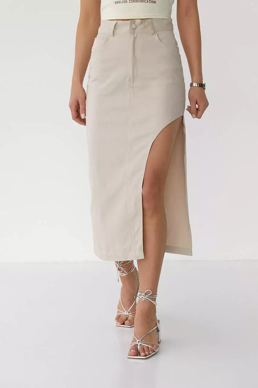 В модели края низа прямые. С левой стороны внизу юбку украшает высокий вырез с полукруглым верхом.
