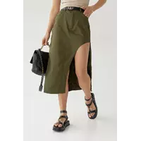 В модели края низа прямые. С левой стороны внизу юбку украшает высокий вырез с полукруглым верхом.