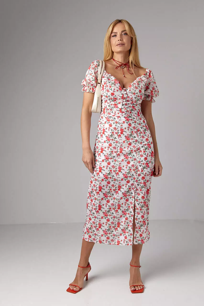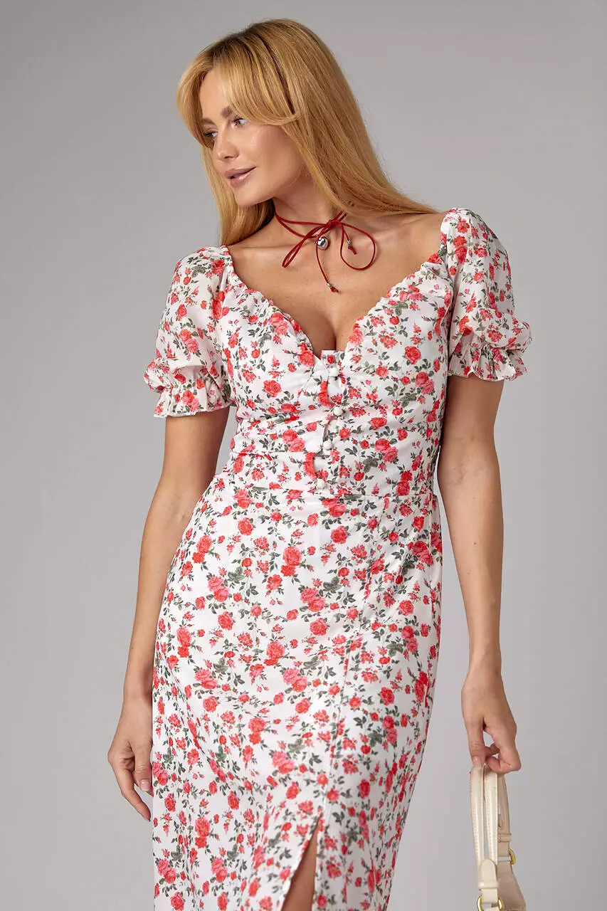 низ украшен высоким разрезом, линия декольте фигурная.