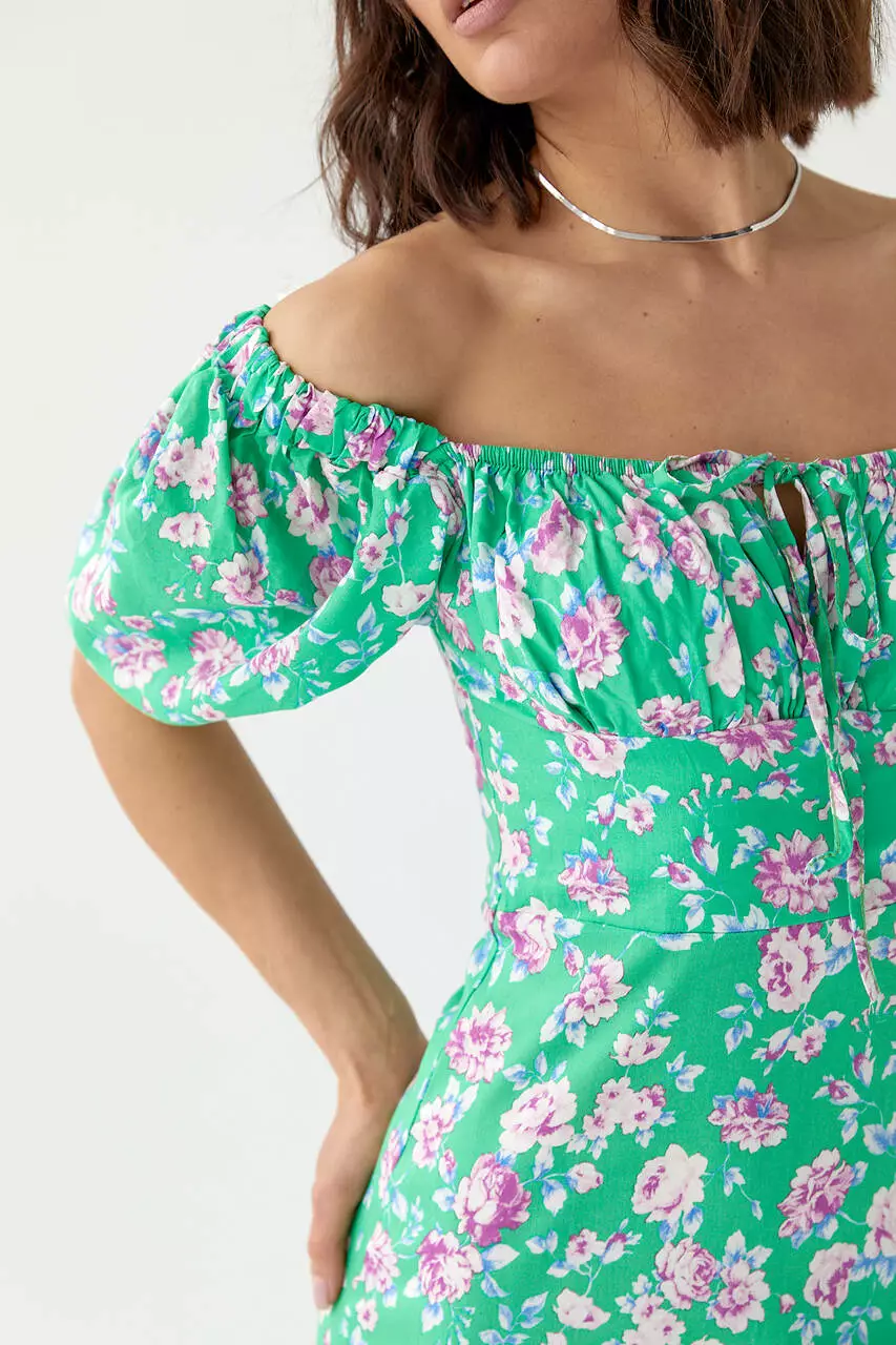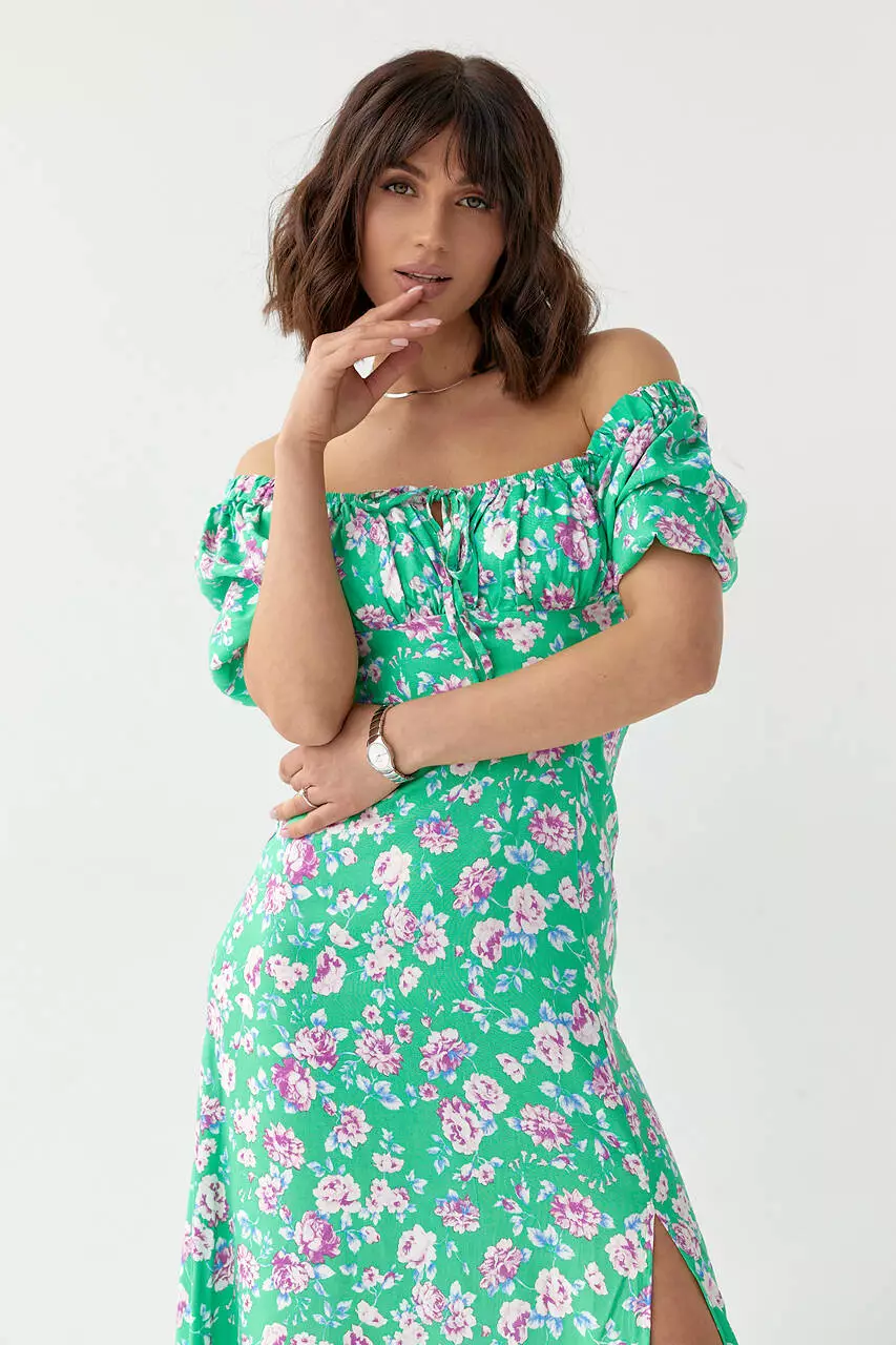 Короткие рукава-фонарики вверху и внизу собраны на резинку, что