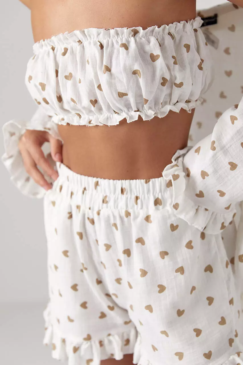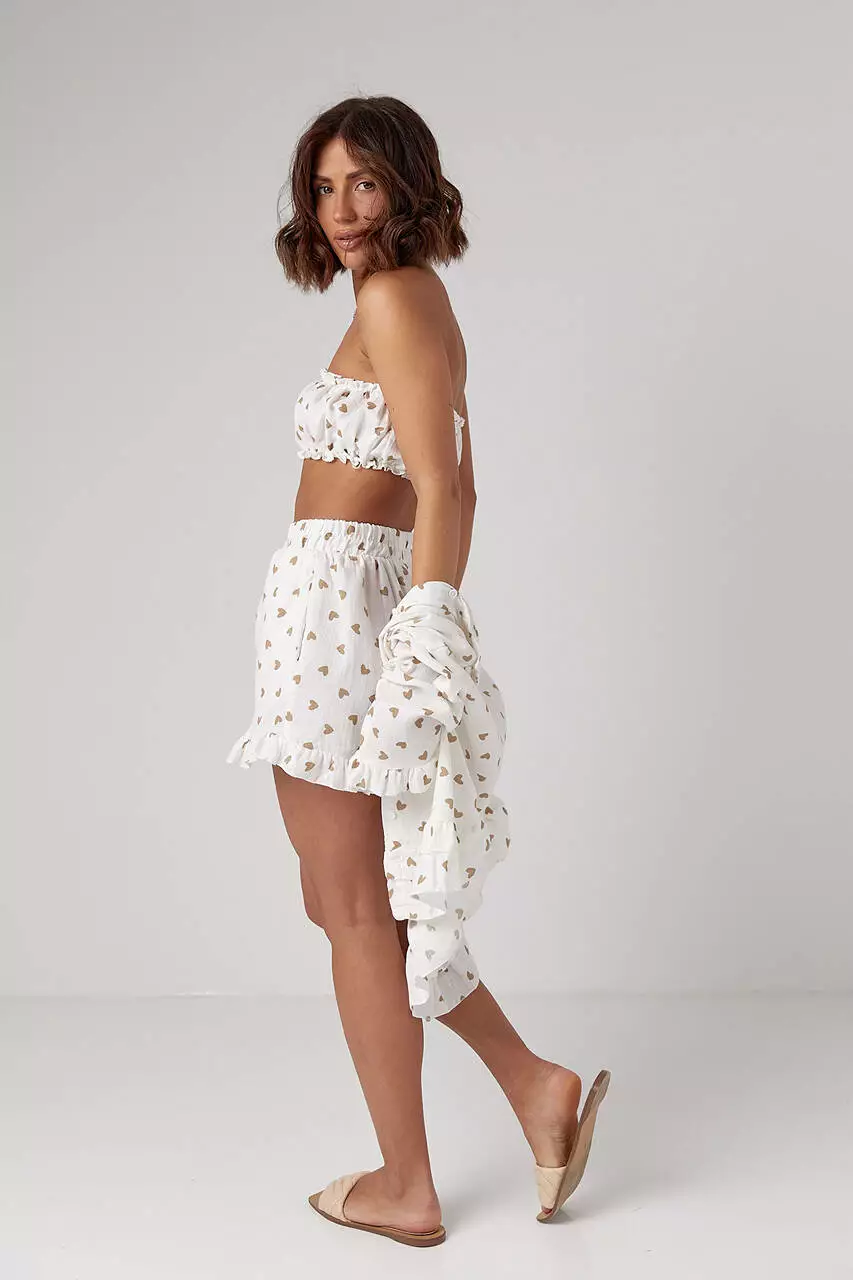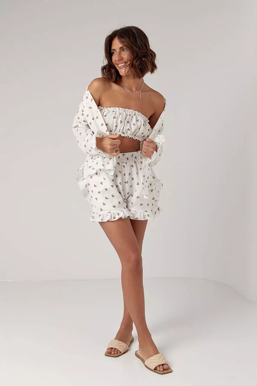 Летний женский костюм-тройка в пижамном стиле, украшенный