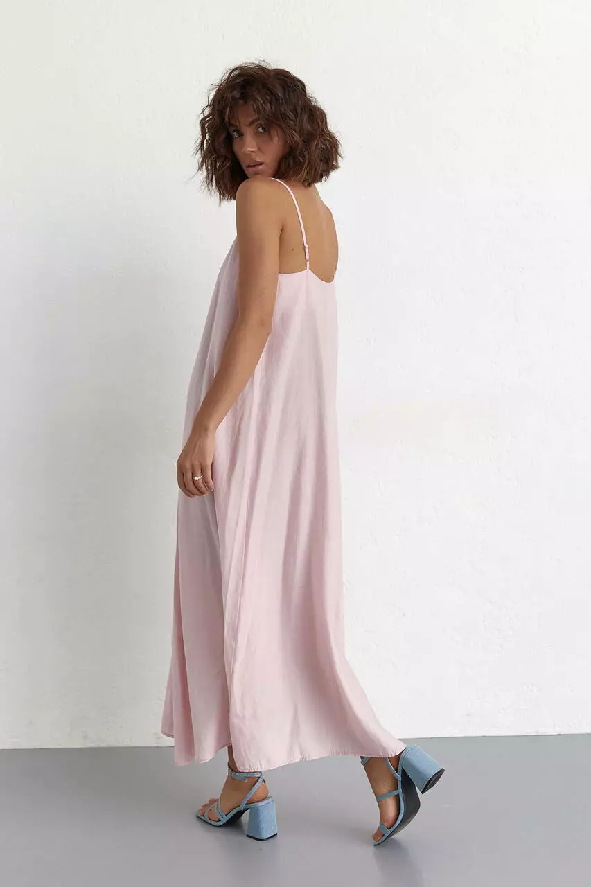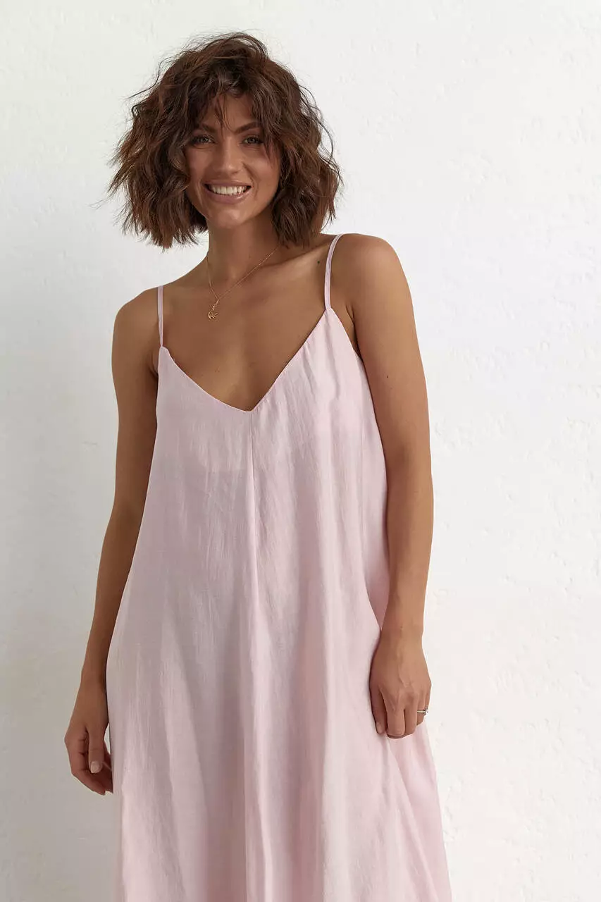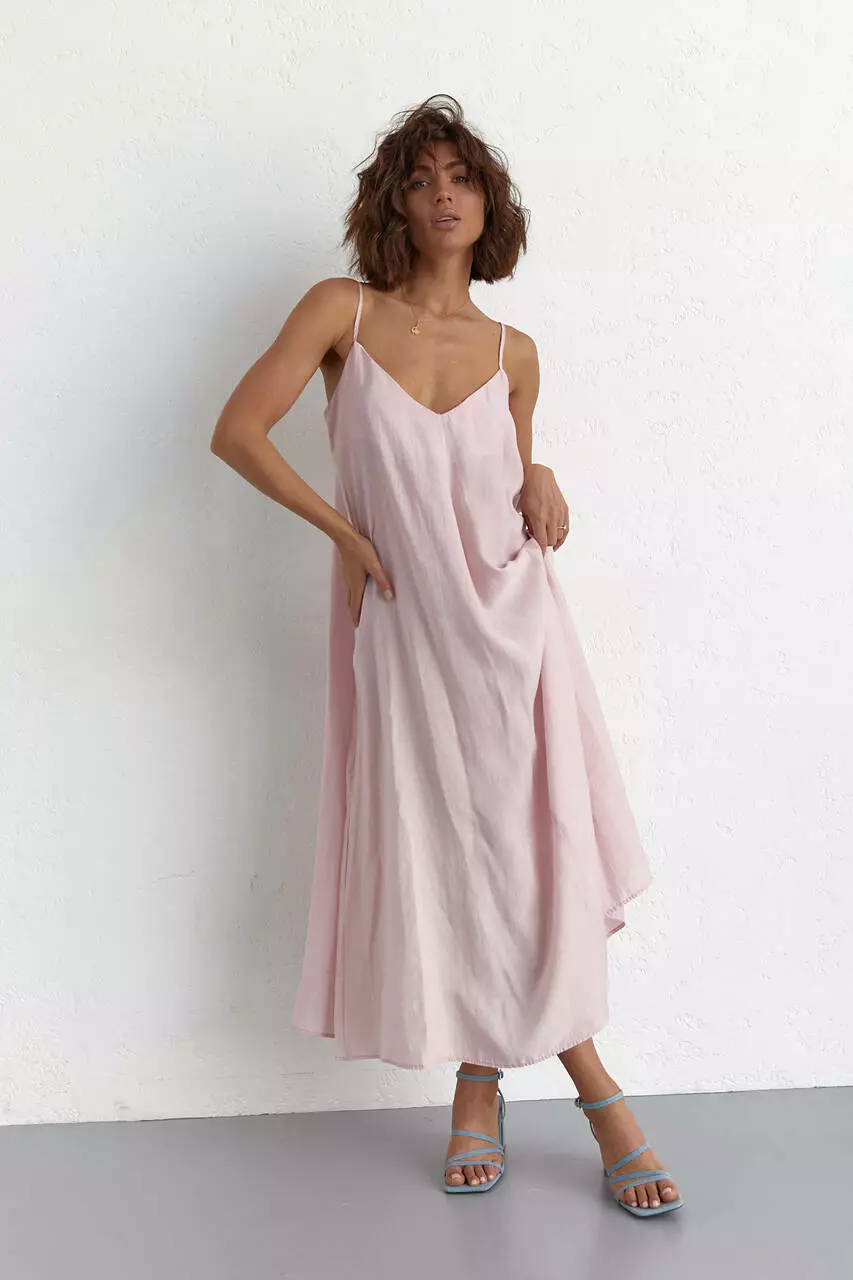 Изделие плавно расклешенное от груди с V-образным декольте. Сарафан идет на тонких регулируемых бретелях.