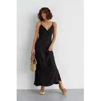 В модели с глубоким декольте тонкие бретели идут без регулировки длины. Линию груди подчеркивает фигурный шов. Низ изделия прямой, спинка открытая.