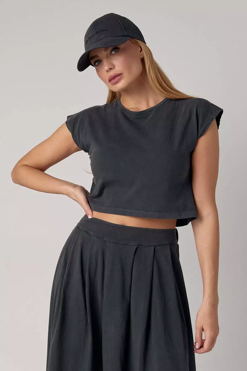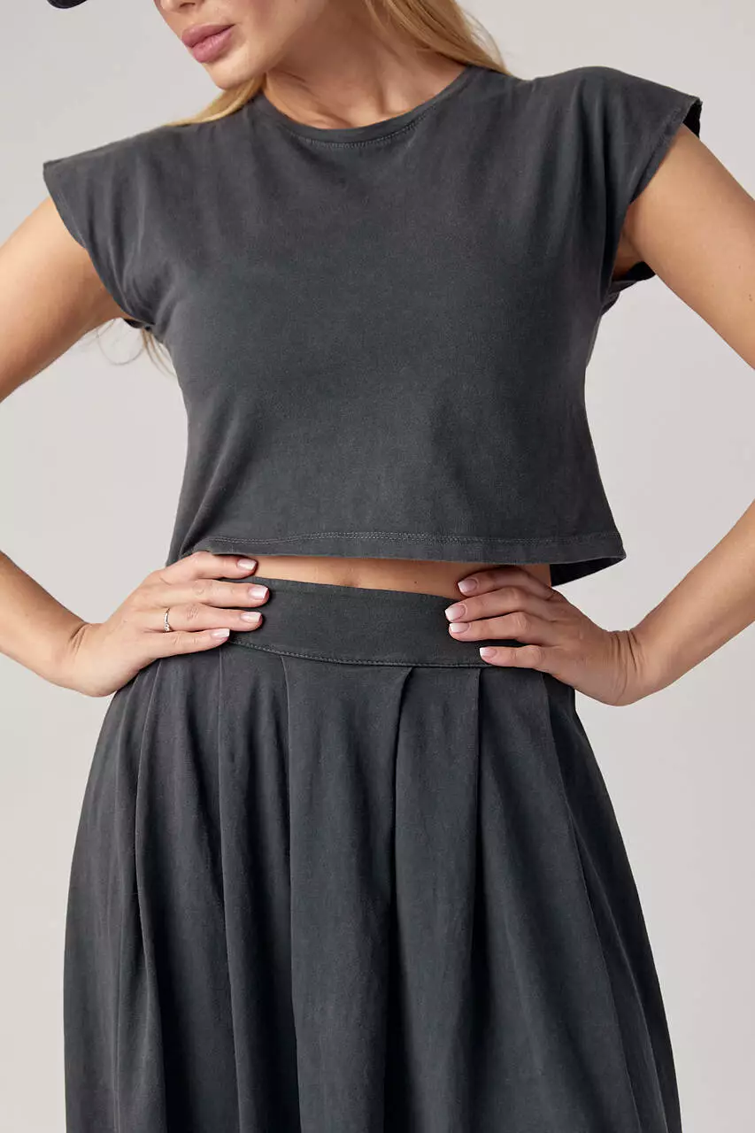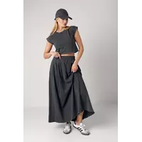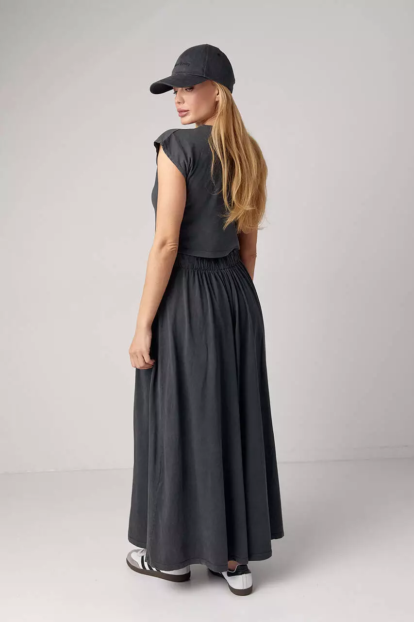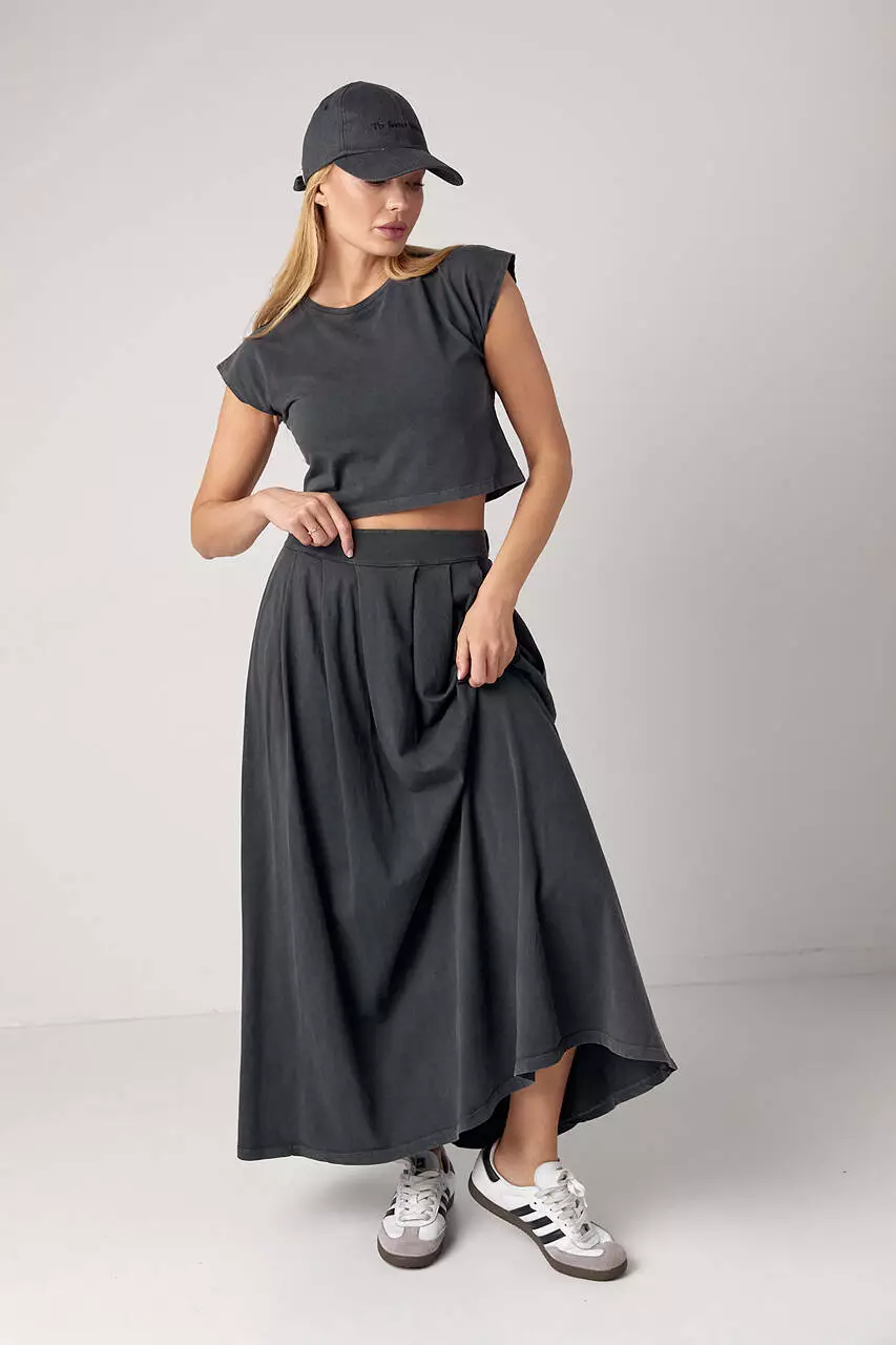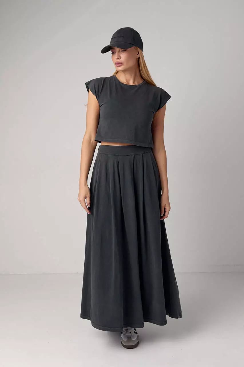 Длинная юбка с поясом на резинке сзади обеспечивает удобную посадку и подчеркивает женскую фигуру. Спереди на юбке присутствуют складки, добавляющие объема и легкости образу.
