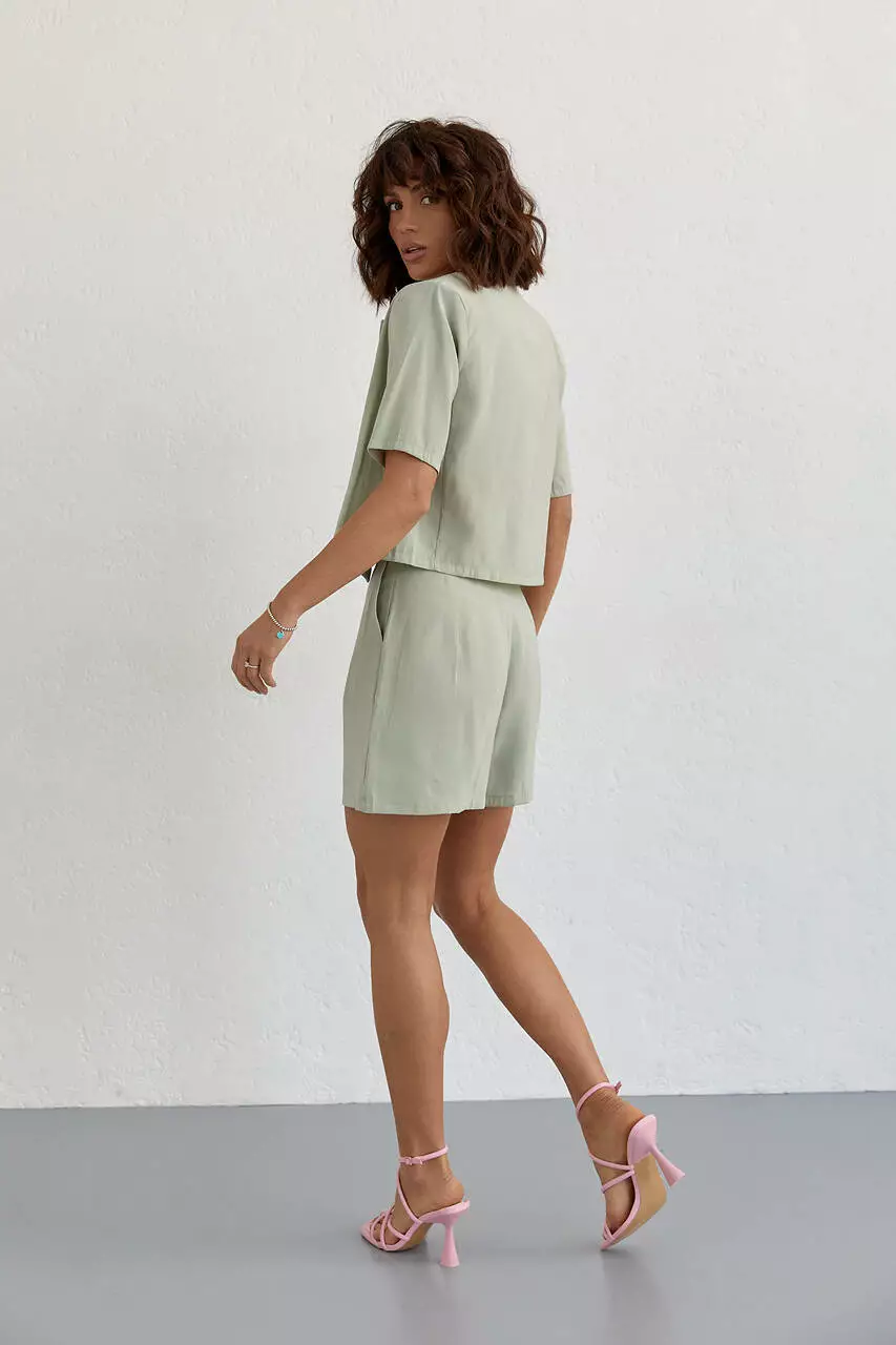 В комплекте идут короткие шорты и жакет без подкладки. В шортах края низа прямые, широкий втачной пояс идет без резинки, а спереди застегивается на две пуговицы и молнию.