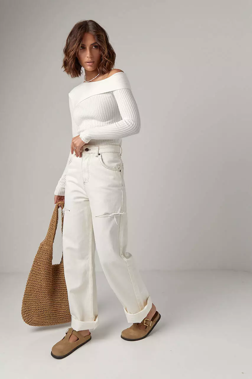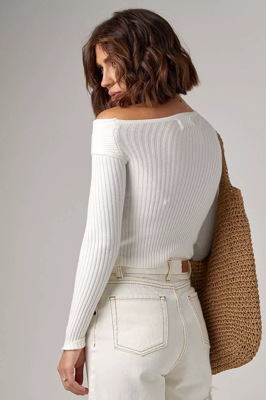 Лонгслив в рубчик с асимметричной горловиной - молочный цвет, M (есть размеры)