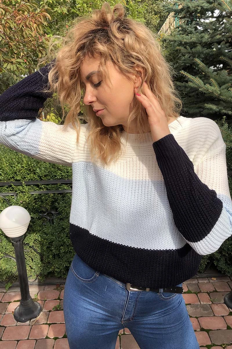 Джемпер в стиле оверсайз разреженной вязки с фактурными крупными геометрическими узорами по низу и верху изделия выполнен в комбинации трех широких полосок разных расцветок..