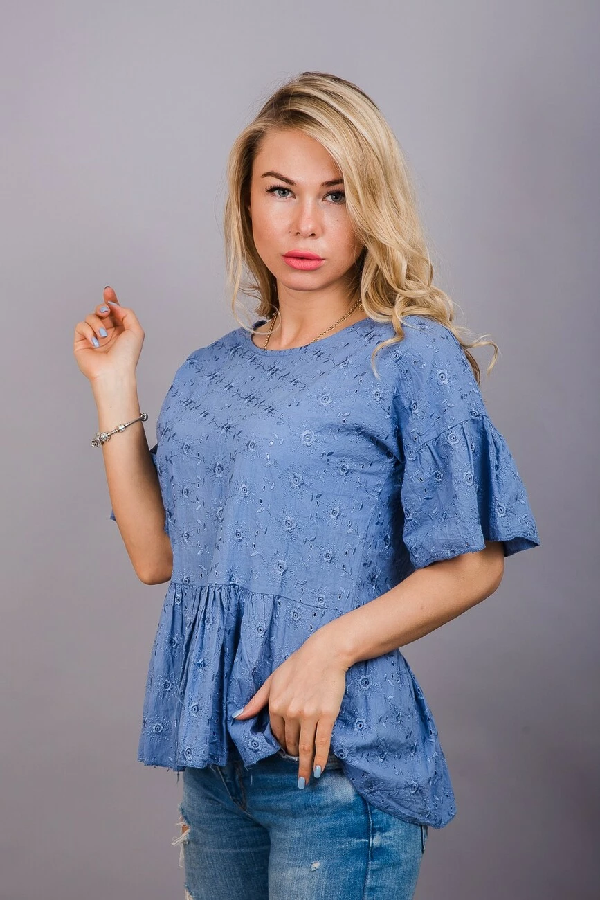 Летом очень важно чувствовать себя комфортно и свободно, поэтому блуза из 100% хлопка - идеальный вариант. Её горловина круглая, свободный силуэт, вместо рукавов - воланы, талия заниженная, плавно перетекающая в юбочку.