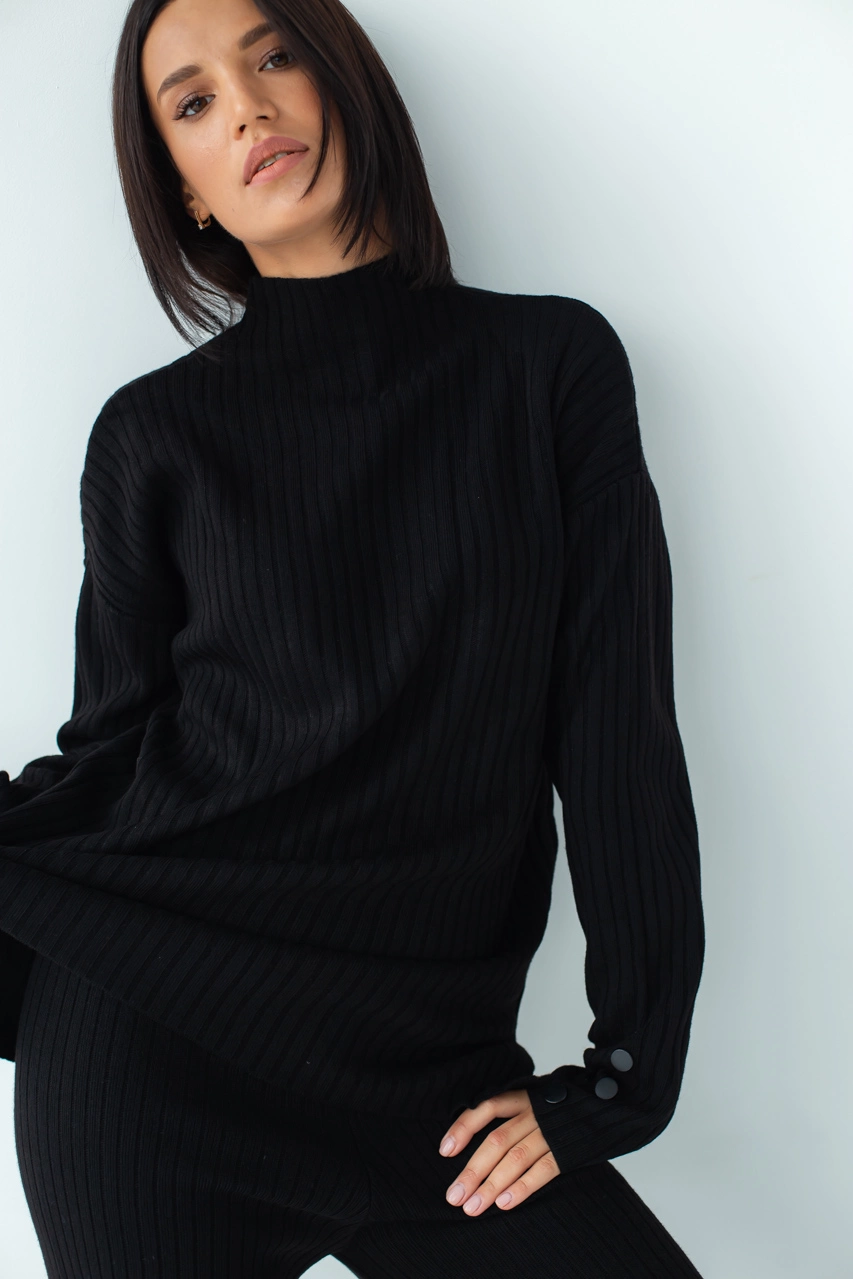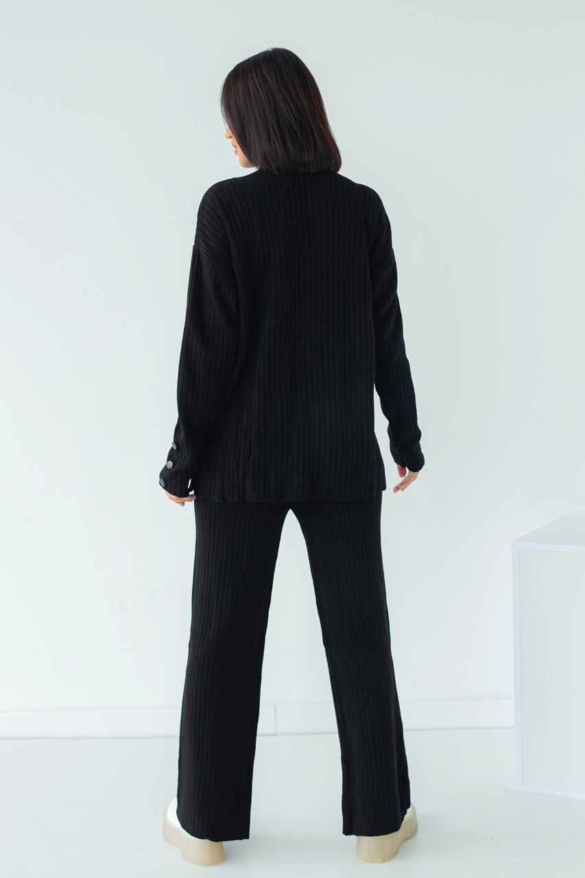Свободный костюм с оригинальной вязкой "лапша" визуально удлиняет