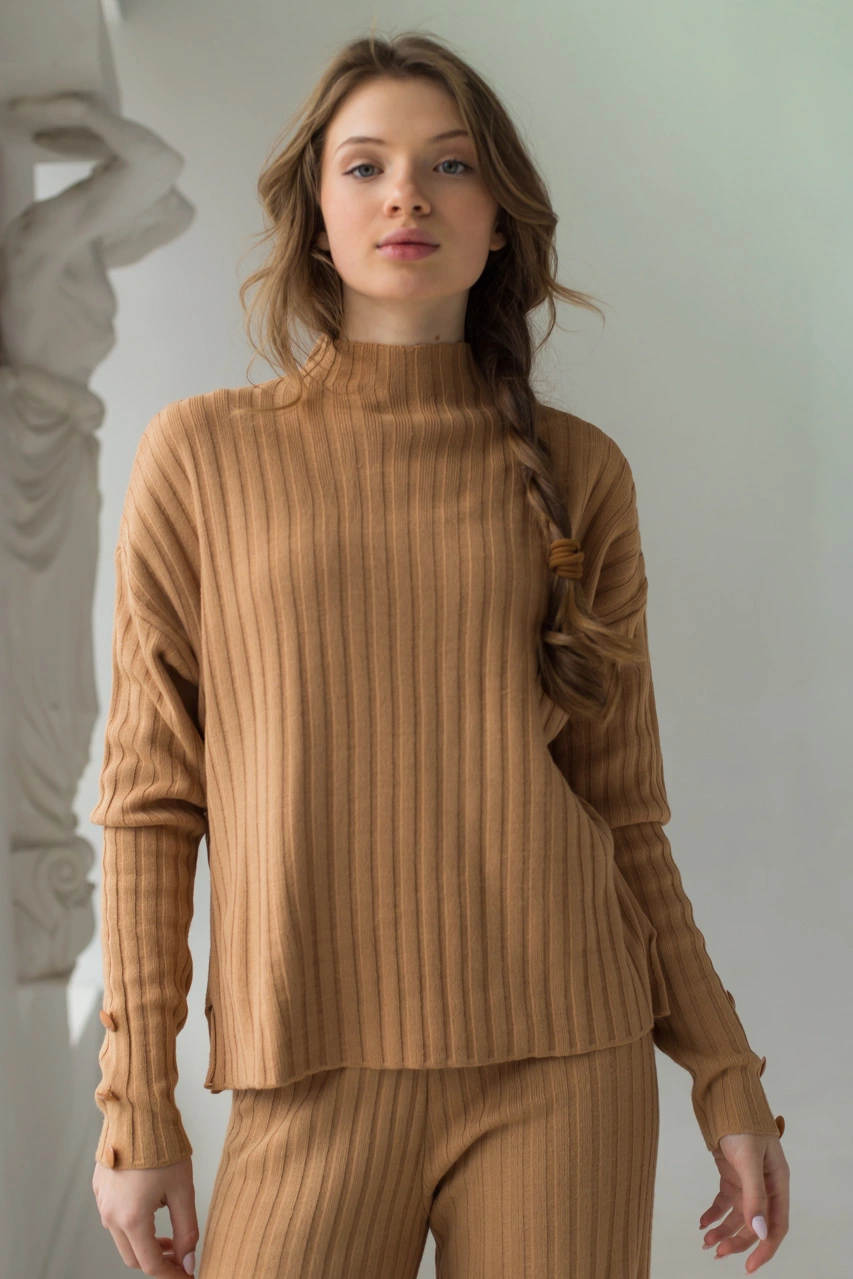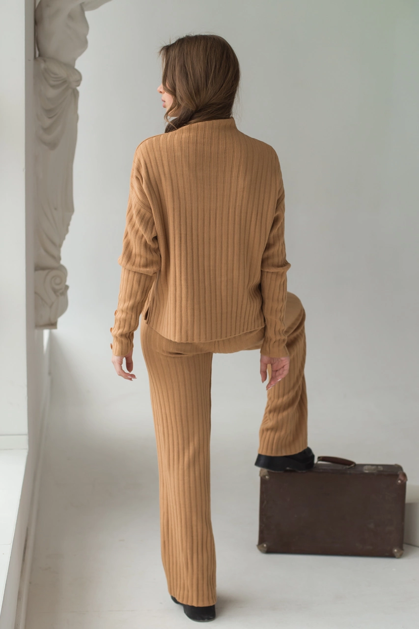 Свободный костюм с оригинальной вязкой "лапша" визуально удлиняет