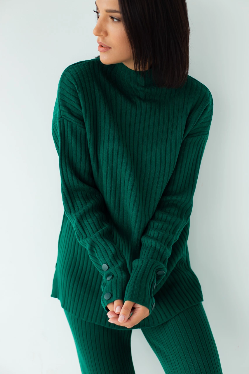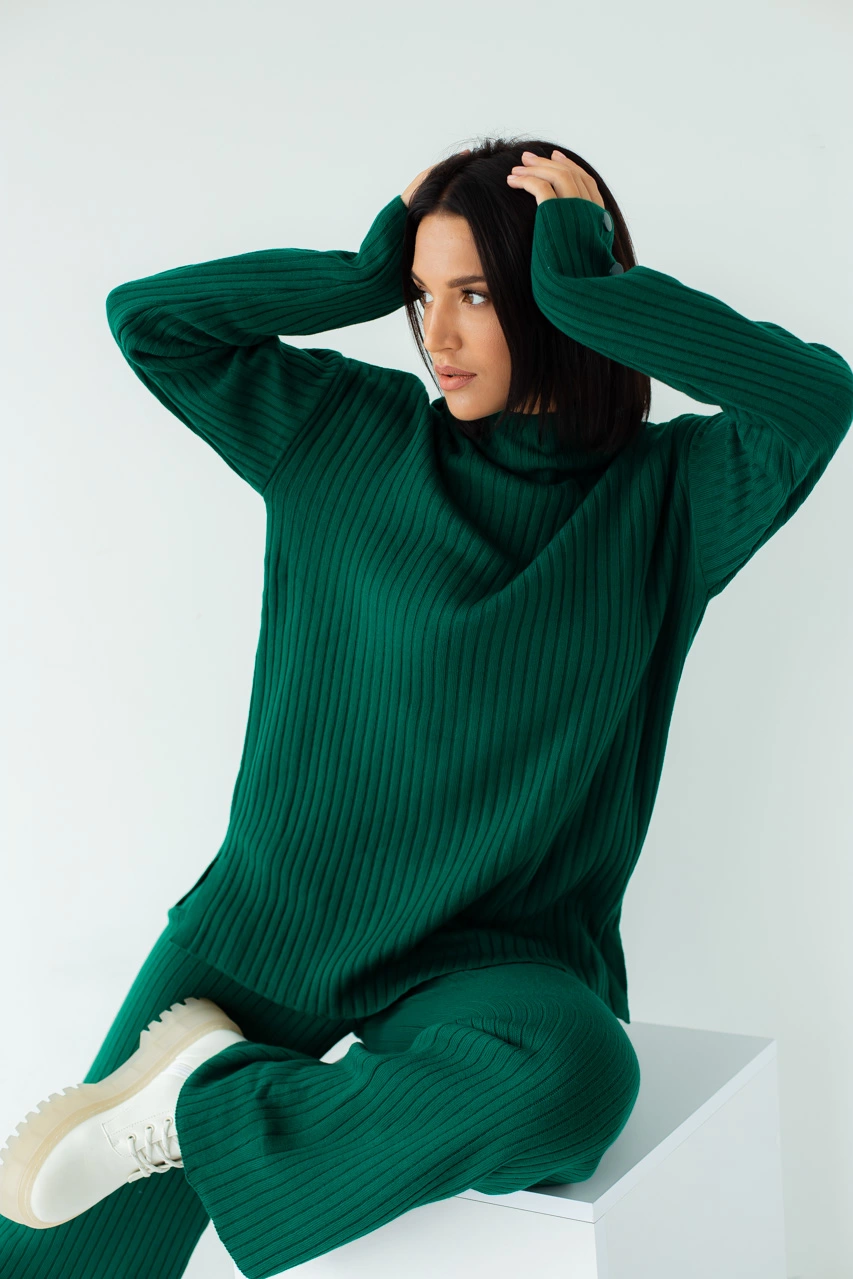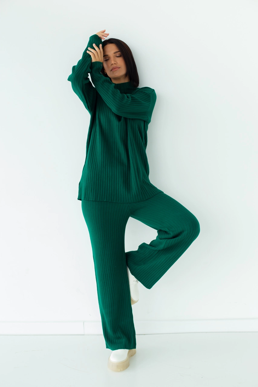 Свободный костюм с оригинальной вязкой "лапша" визуально удлиняет