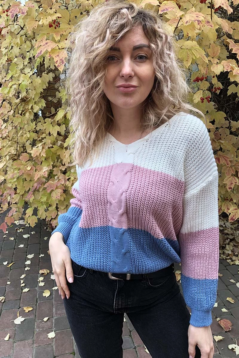 Оригинальный вязаный пуловер свободного покроя выполнен из объемной вязки в широкие горизонтальные разноцветные полоски. V-образный вырез горловины украшает вязаный узор раздвоенной косы, тянущийся до низа изделия, - модный тренд сезона.