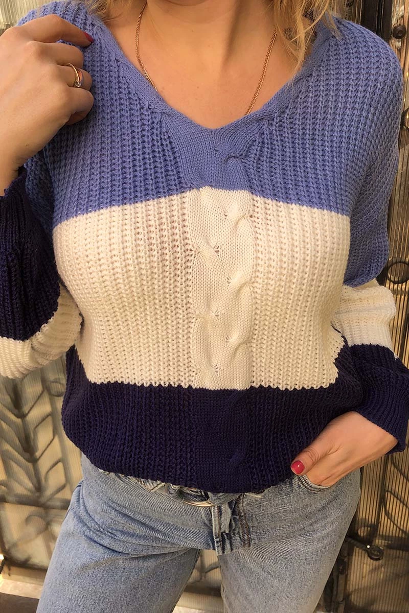 Оригинальный вязаный пуловер свободного покроя выполнен из объемной вязки в широкие горизонтальные разноцветные полоски. V-образный вырез горловины украшает вязаный узор раздвоенной косы, тянущийся до низа изделия, - модный тренд сезона.